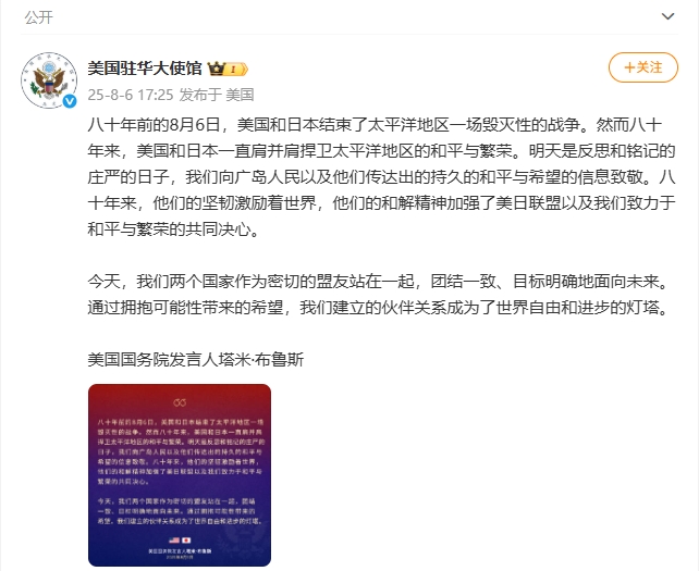 美國駐華大使館以美國國務院發言人塔米·布魯斯的名義發文稱,80年前的8月6日,美國和日本結束了太平洋地區一場毀滅性的戰爭。然而80年來,美國和日本一直肩並肩捍衛太平洋地區的和平與繁榮。