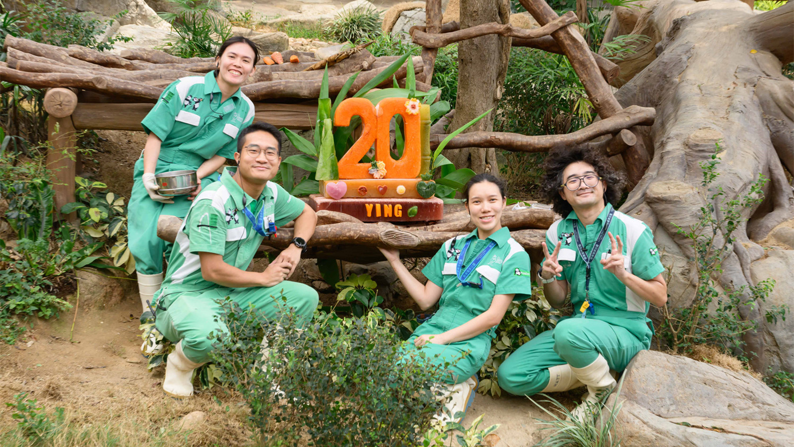 海洋公園團隊選用大熊貓喜愛吃的紫薯、紅蘿蔔、蘋果和新鮮竹葉,作為冰蛋糕主要材料,砌出「2」、「0」字樣,以及象徵生命力、正氣和繁榮的巨型竹筍。