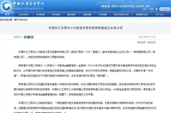 【橙訊】據報道,中國外匯交易中心與港交所(00388)昨日(7日)宣佈,在香港成立合資公司「債券通有限公司」,雙方分別佔60%和40%權益,債券通公司將承擔支持「債券通」相關交易服務職能。