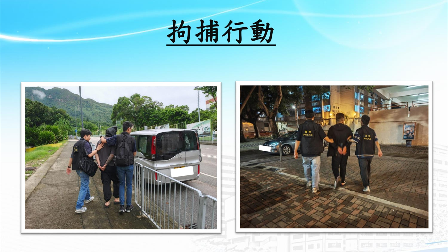 除了上述已被檢獲的13部私家車,警方亦通過翻閱大量閉路電視以及深入調查及情報分析,鎖定了另外5部停泊在屯門區的相關目標車輛。新界北總區刑事部聯同元朗及屯門警區刑事部,在8月5日至8月7日針對目標人物及車輛展開拘捕及執法行動。警方行動仍然進行,相信會在較後時間有更多人被捕,以及尋獲更多相關車輛。