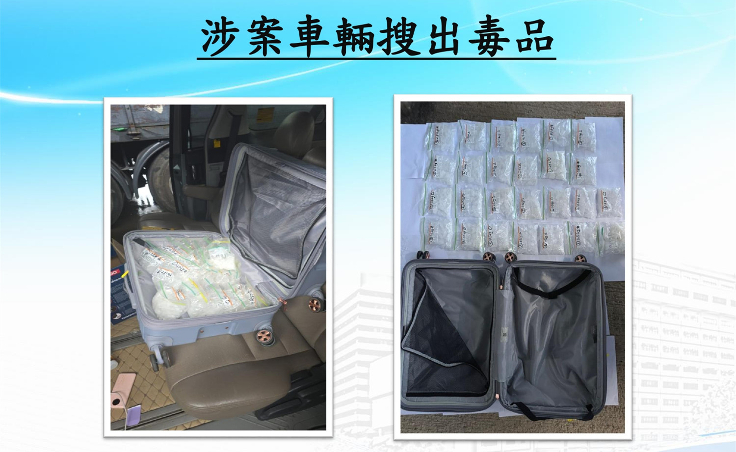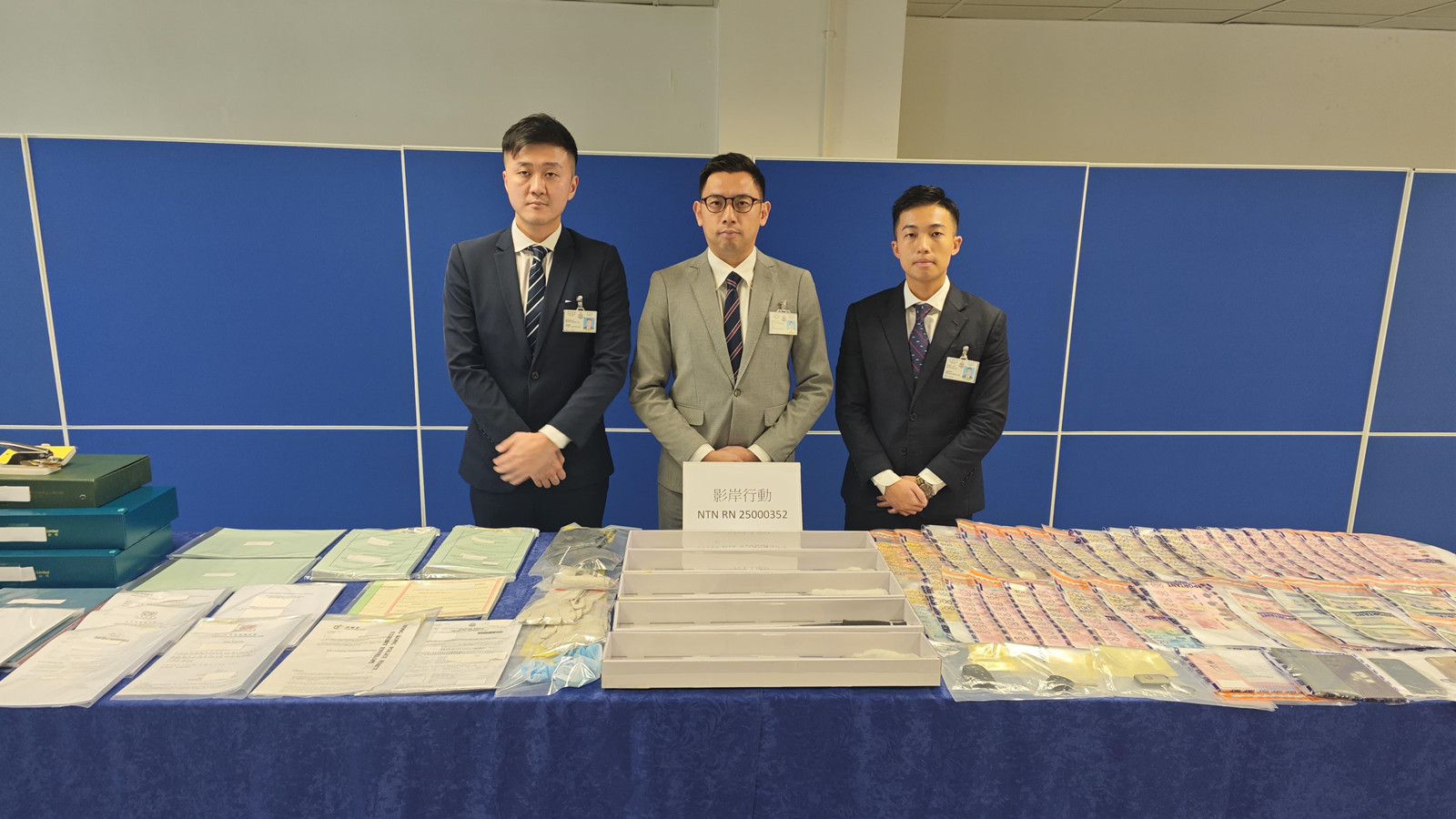 行動中,警方檢獲了一批證物,包括18架由非法開設的空殼公司所登記的私家車,市值共約港幣130萬元。而在其中一輛涉案私家車上,同時檢獲約6.5公斤的懷疑「冰」毒,市值約340萬元;現金約10萬港元及一系列公司登記的相關文件。