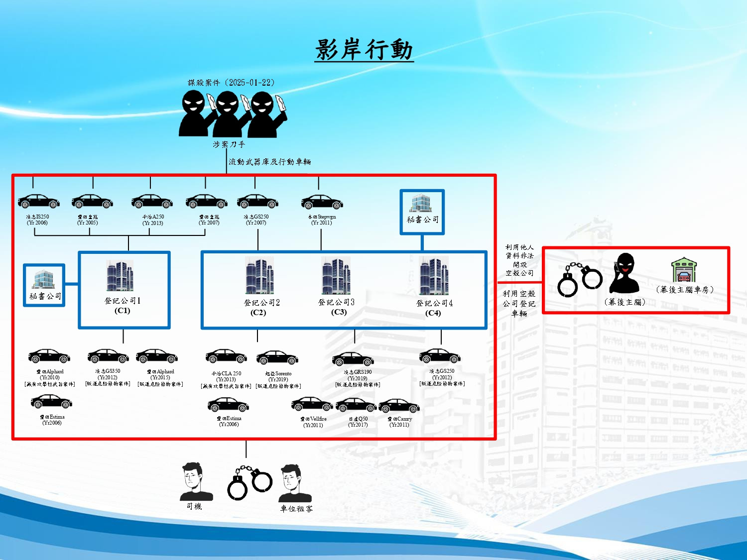 該4間公司分別報稱從事物流、設計、投資及汽車相關的業務,分別由2024年4月至10月期間註冊成立,該些公司共登記59部領有正式牌照的私家車。在拘捕行動前,警方已發覺該59部私家車中,有13部已因不同刑事案件而被檢獲,包括上述謀殺案中,用作接載刀手的6部私家車,以及另外7部用作干犯其他罪行,包括發生在屯門、元朗及深水埗區的藏有攻擊性武器及販運危險藥物的案件。