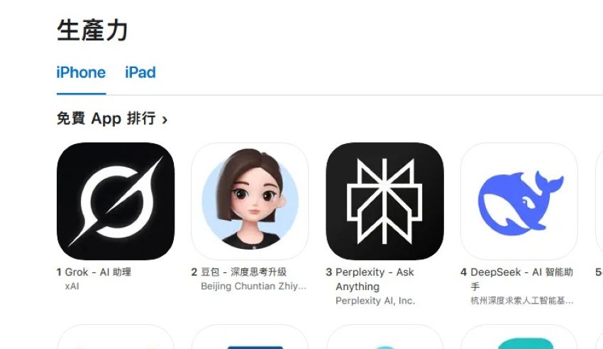 Grok 4的免費用戶每天可小量查詢,若超過限制就需要付費訂閱。在蘋果App Store的生產力免費軟件排名中,Grok目前位居榜首,其次為字節跳動旗下的豆包,Perplexity及DeepSeek則分別排第三及第四位。