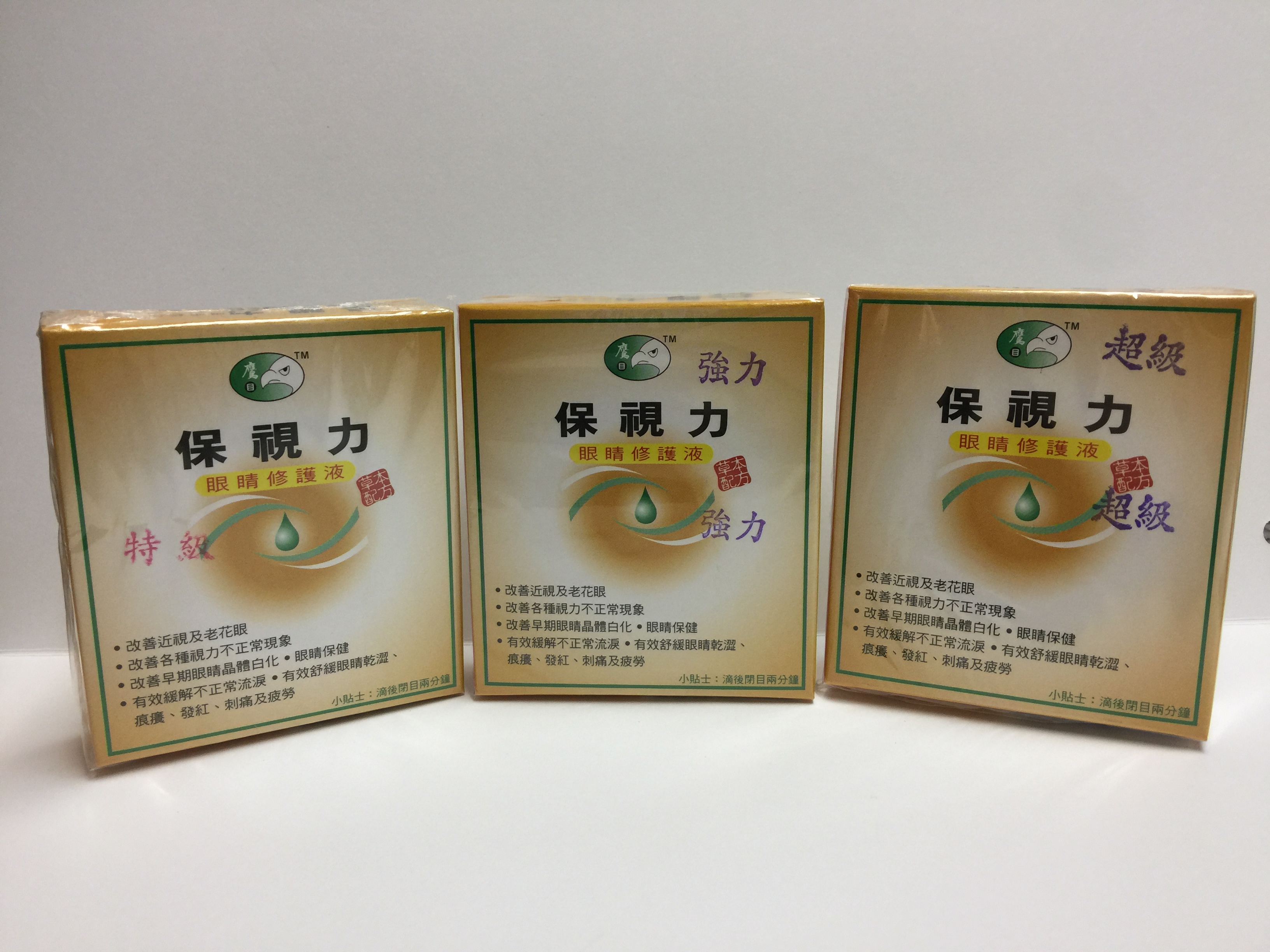 衞生署表示,上月在九龍尖沙咀麼地道67號半島中心1樓155室的正食字號企業有限公司中,檢獲3款懷疑未經註冊中成藥,均為同一名稱及包裝。一款另外印有「強力」字樣、一款另外印有「超級」字樣和一款印有「特級」字樣。而其中一款印有「超級」字樣的樣本經無菌檢查後,證實未能通過眼用製劑的無菌規定,反映該產品的安全和品質存在問題。