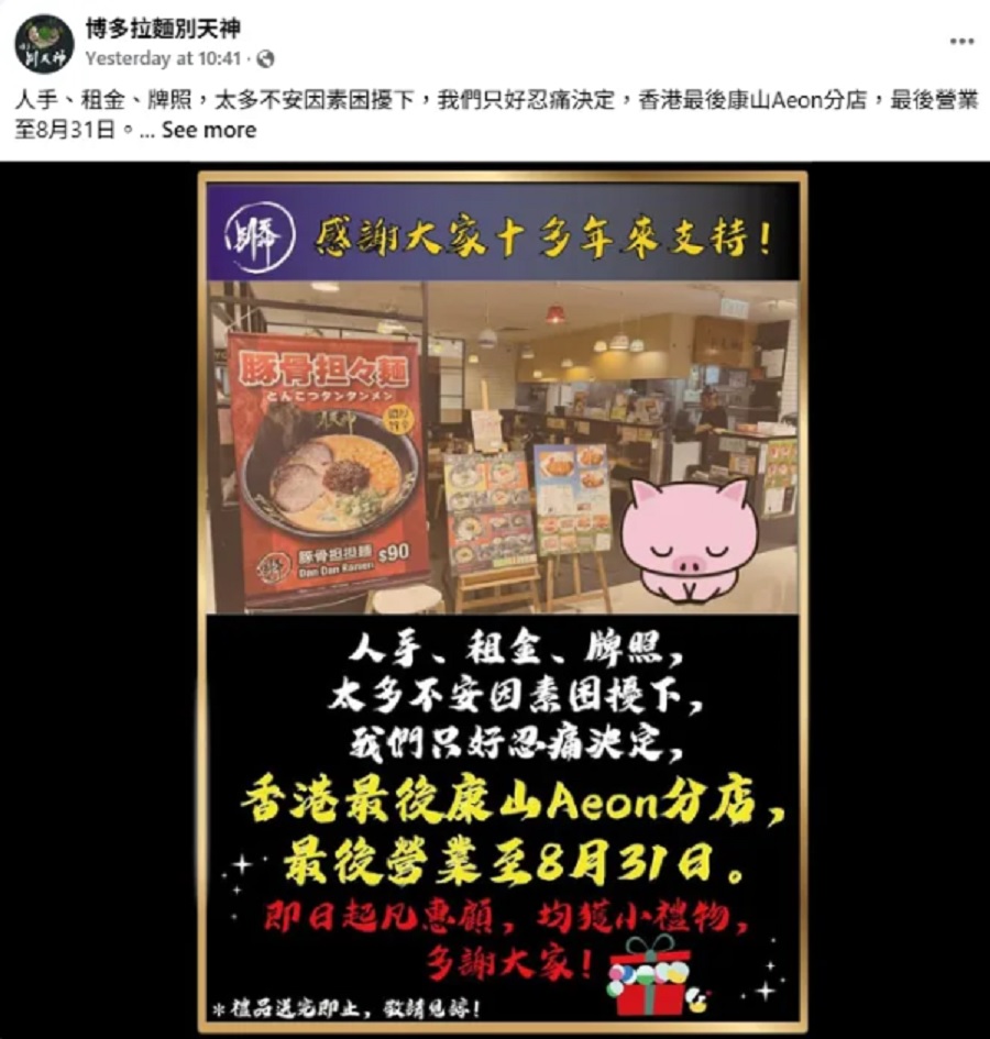 別天神拉麵周二(12日)在社交平台帖文公布,由於受到「太多不安因素困擾」,包括人手、租金及牌照,決定結束在康山Aeon的最後一間分店,最後營業日為8月31日。帖文又感謝食客的10多年來的支持,由即日起凡到場惠顧,都可獲得小禮物。