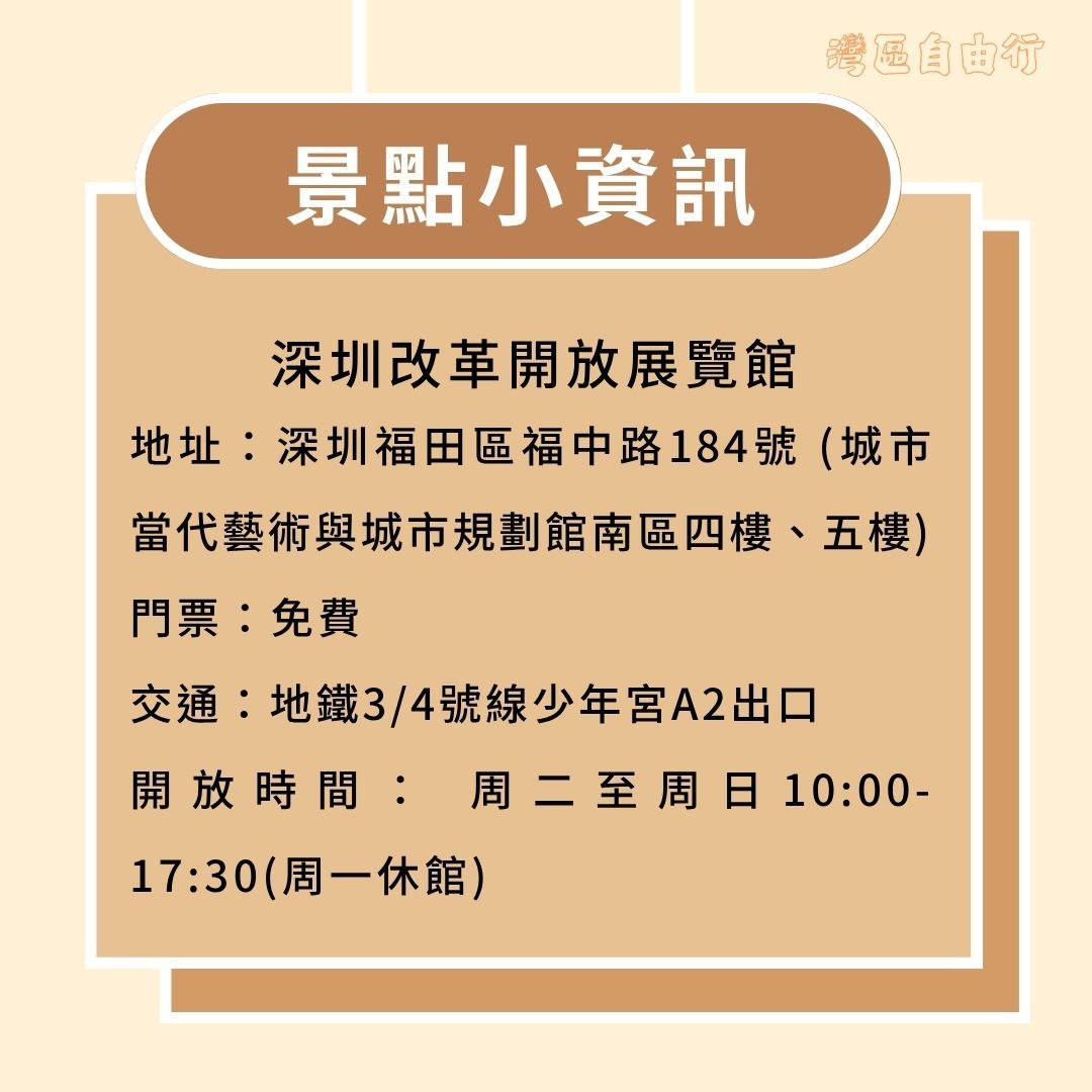 深圳改革開放展覽館是深圳為紀念改革開放40周年而設立的大型文化博物館,於2018年開放,以「大潮起珠江」為主題,透過歷史照片、實物展品、場景復原、多媒體互動等形式,系統呈現出自1978年以來深圳的成長和脫變。