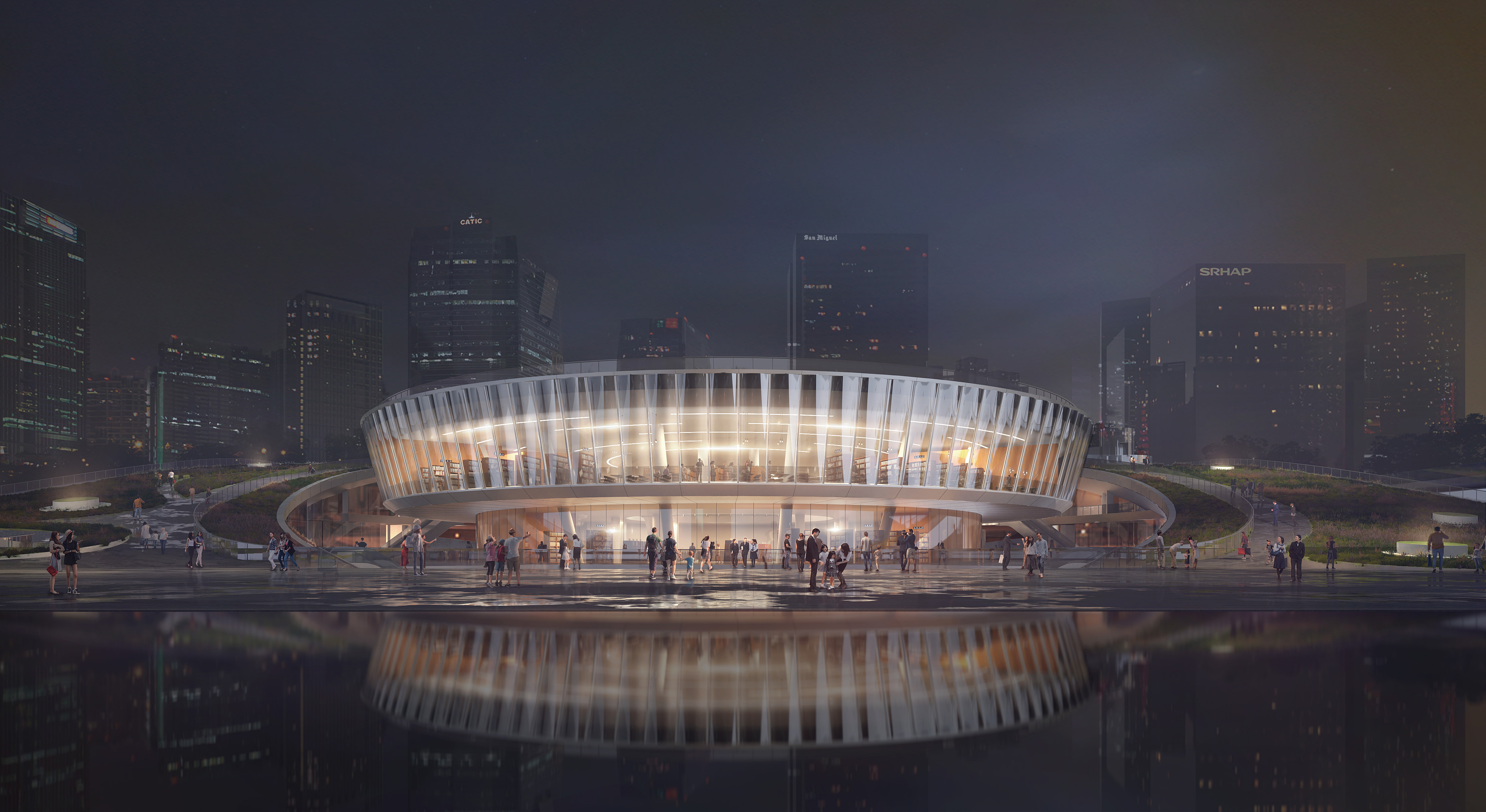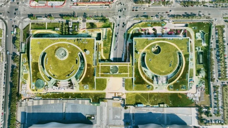 「灣區之眼」建築分南北兩區,地上、地下兩層,「雙玉盤」設計將書城與公園景觀和諧相融,用屋頂公園、公共通廊構建出與自然一體的人文空間。書城直連深圳5號線地鐵寶華站,且與壹方城、歡樂港灣、寶安區圖書館與區青少年宮、濱海演藝中心相去不遠,充分整合文化、藝術、科技、自然與商業資源,為遊客帶來多元全面的文旅體驗。