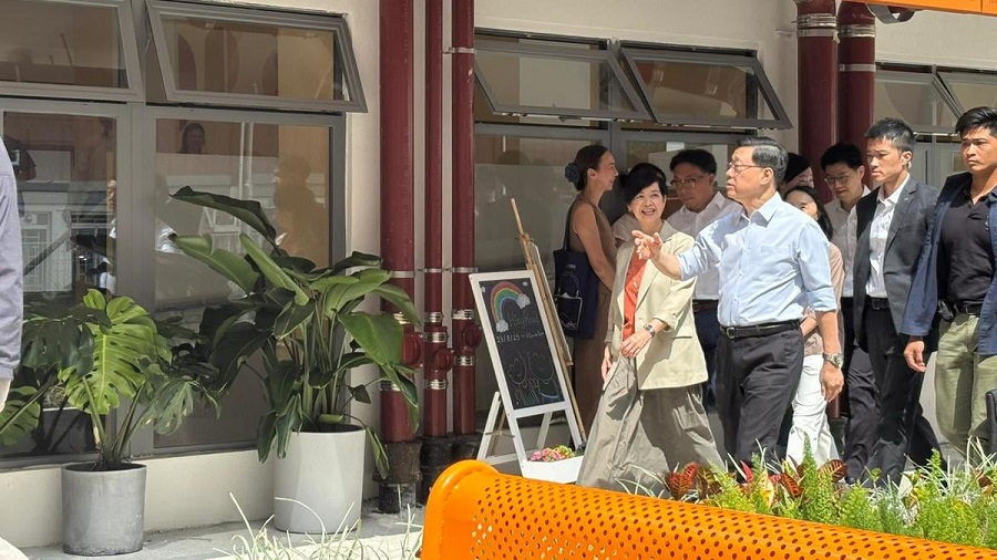 李家超與居民交流後,聽取職員介紹簡約公屋設施,包括智能回收衣物櫃,了解巿民累積積分及回數衣物的方法,亦參觀了簡約公屋的周末巿集。