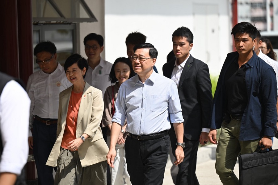 【橙訊】《施政報告》將於9月發表,行政長官李家超今早落區,到牛頭角彩興路簡約公屋探望住戶。房屋局局長何永賢及房屋署署長李佩詩在場迎接,並陪同李家超上樓,現場有警員維持秩序。
