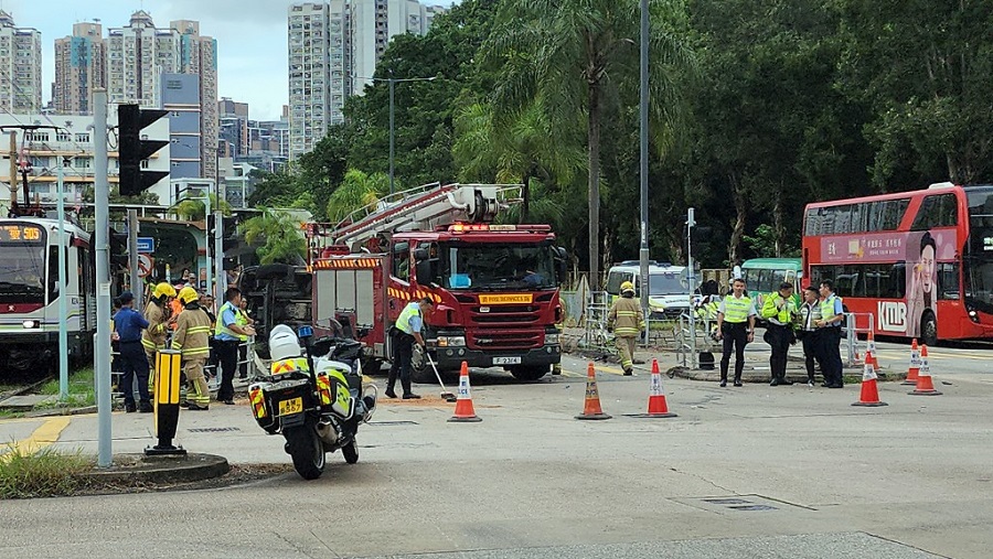 【橙訊】屯門輕鐵石排站對出有消防車與私家車相撞,消防車翻側橫臥路中,車上3名消防員受輕傷。