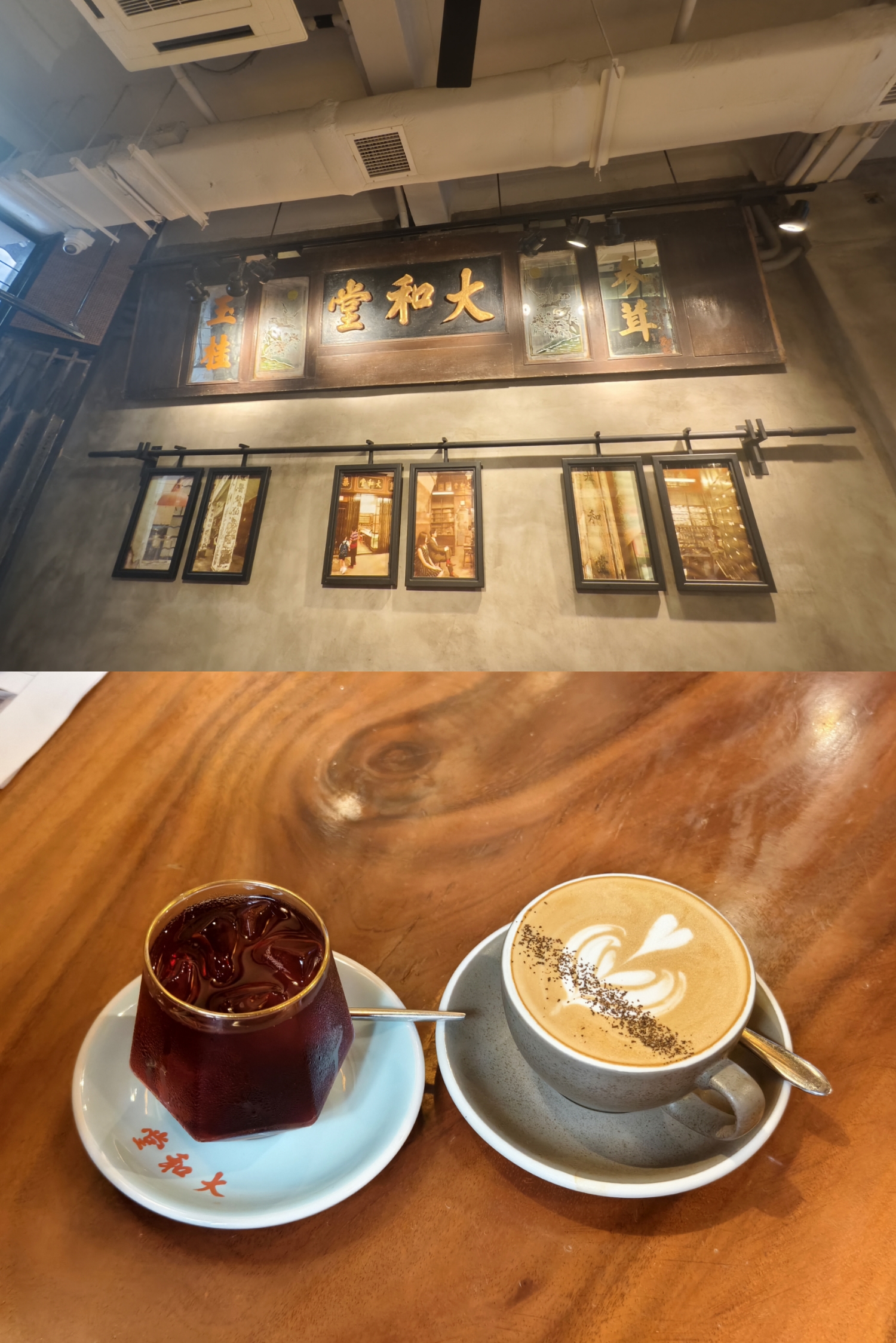 大和堂咖啡店由80年歷史的「大和堂蔘茸藥行」舊建築活化而成,以原有的百子櫃、金漆牌匾、舊鐵閘、百葉窗、木製長椅等重新建構空間,將舊藥房變為型格cafe,佈景卻依舊古風古韻。