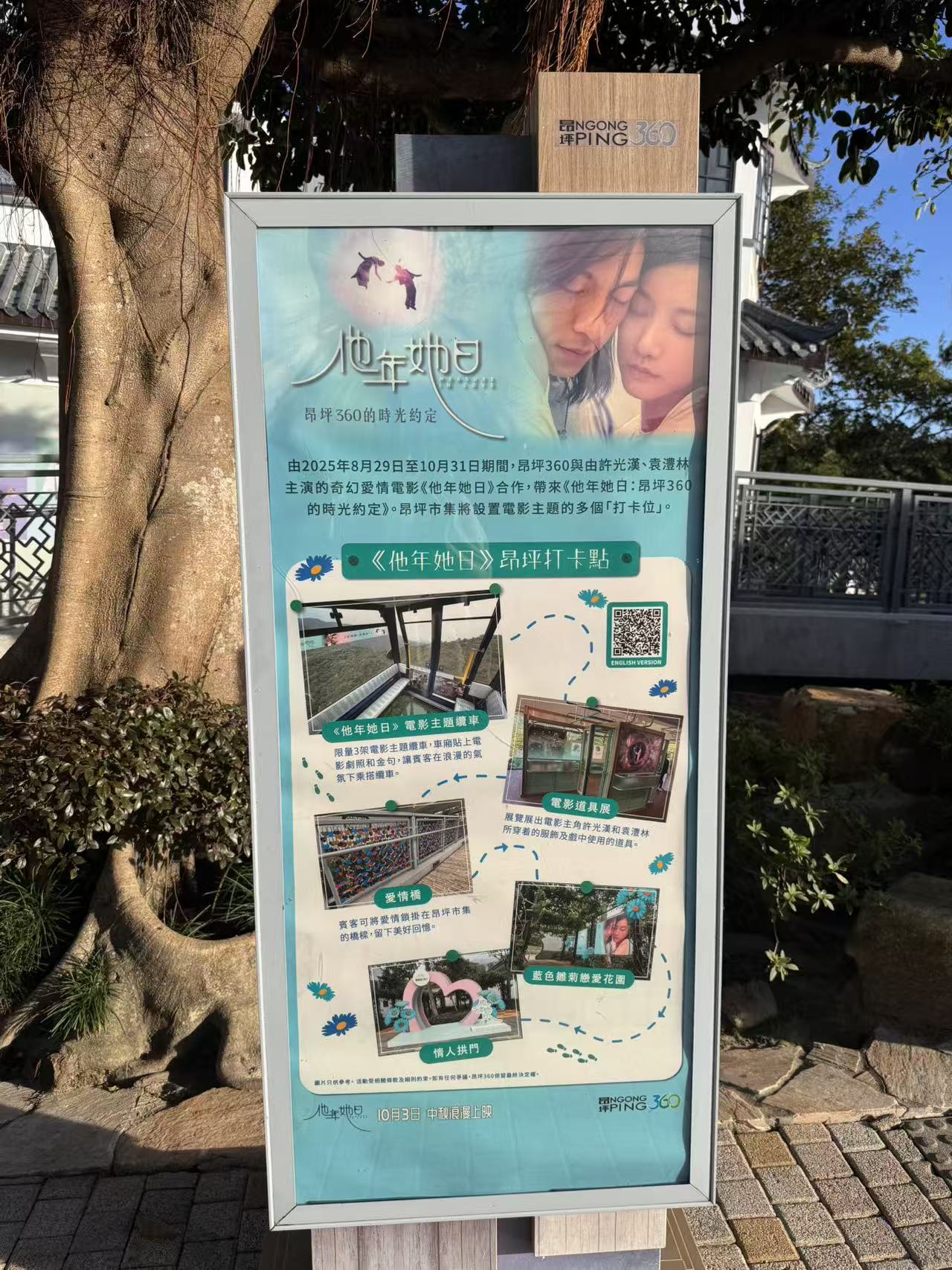 由2025年8月29日至10月31日期間,昂坪360與《他年她日》合作,帶來《他年她日:昂坪360的時光約定》。昂坪市集將設置由電影藝術總監文念中監督打造的三大「打卡位」,包括愛情橋,供賓客掛上情人鎖;情人拱門,讓情人甜蜜拍照;及藍色雛菊戀愛花園。另外,許光漢和袁澧林在電影中穿著的服飾,以及所使用的懷錶、電報機等道具亦會獨家在昂坪市集展出,營造浪漫氛圍,到昂坪遊玩的朋友不容錯過。