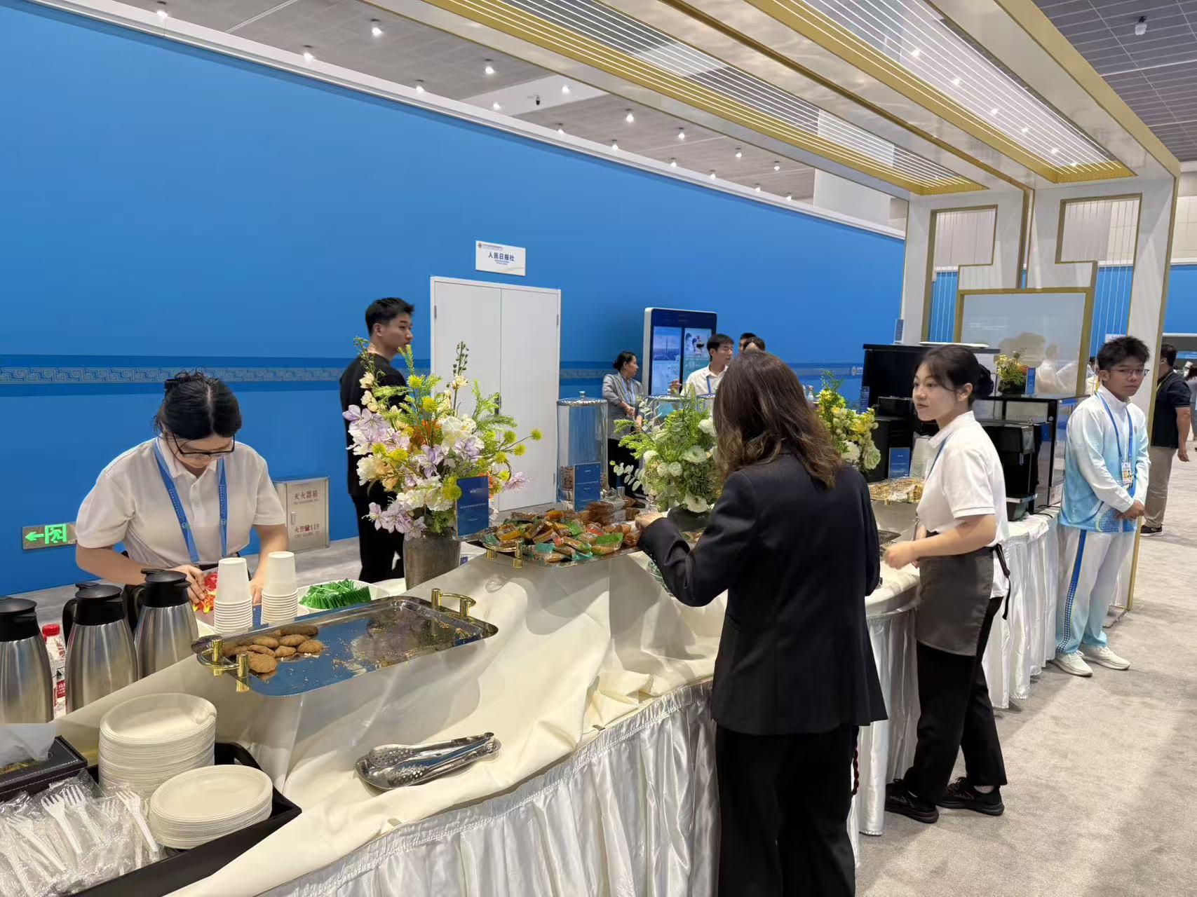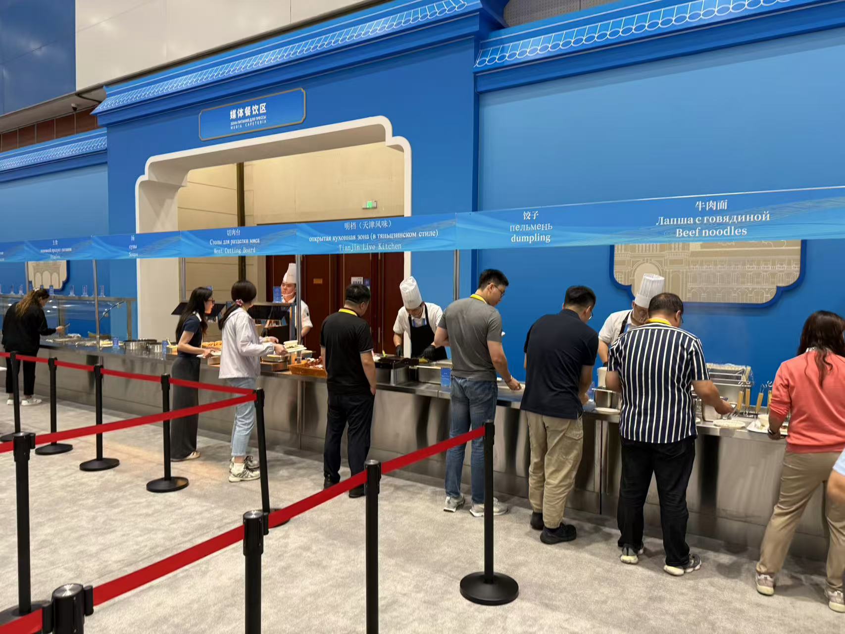在餐飲方面,新聞中心餐飲區會分別在中午和晚上提供服務。餐廳內的菜色豐富,並有中西式的各種選擇,亦有天津的特色食物,可以滿足來自世界各地的記者的餐飲口味和需求。此外,新聞中心走廊的兩側亦設有茶歇區,提供咖啡、乳酪、小點心等,方便記者們在工作中補充體力,更可以認識新朋友。