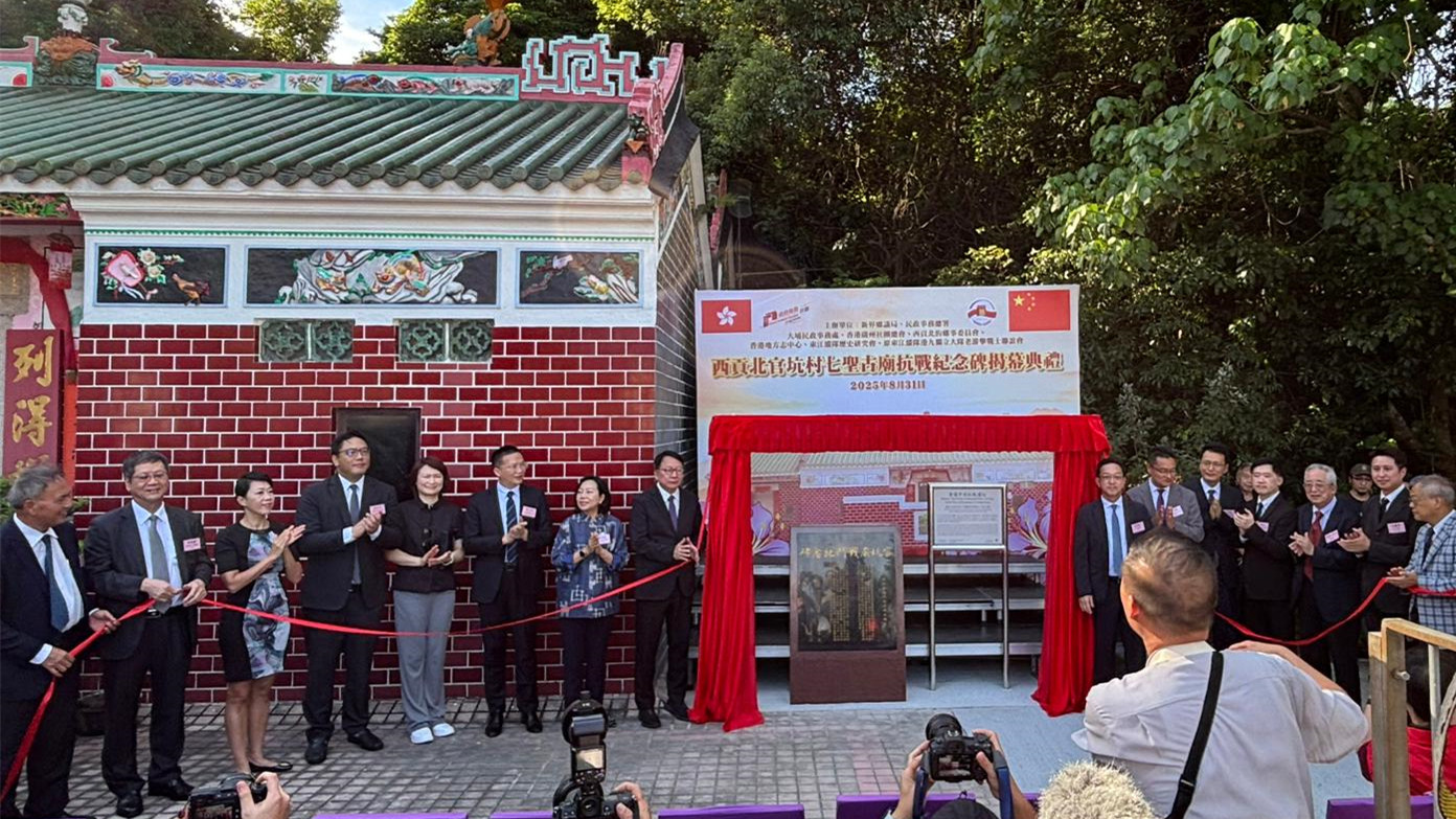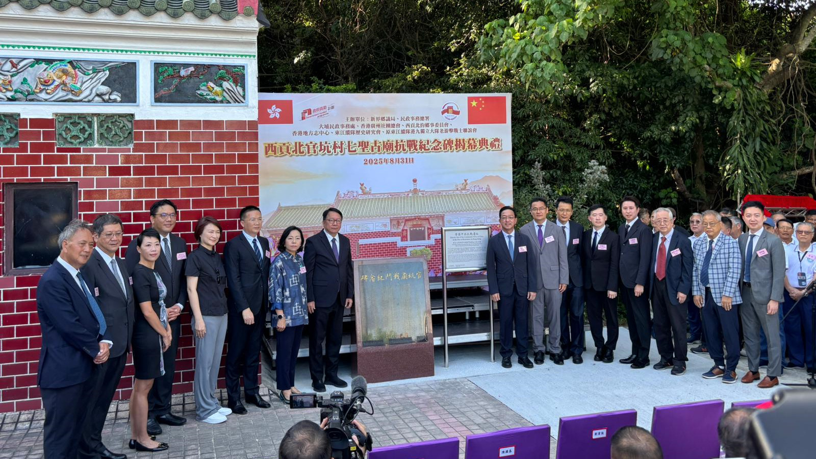 【橙訊】今年是中國人民抗日戰爭暨世界反法西斯戰爭勝利80周年,西貢北官坑村七聖古廟抗戰紀念碑今日舉行揭幕典禮。政務司司長陳國基出席典禮並致辭,他說,今天在這裏立碑,不單止是為了緬懷先烈的英勇事跡,更是為着弘揚他們不屈不撓的抗戰精神。這種精神,體現中華民族的堅毅品格,也是推動社會進步的重要力量。