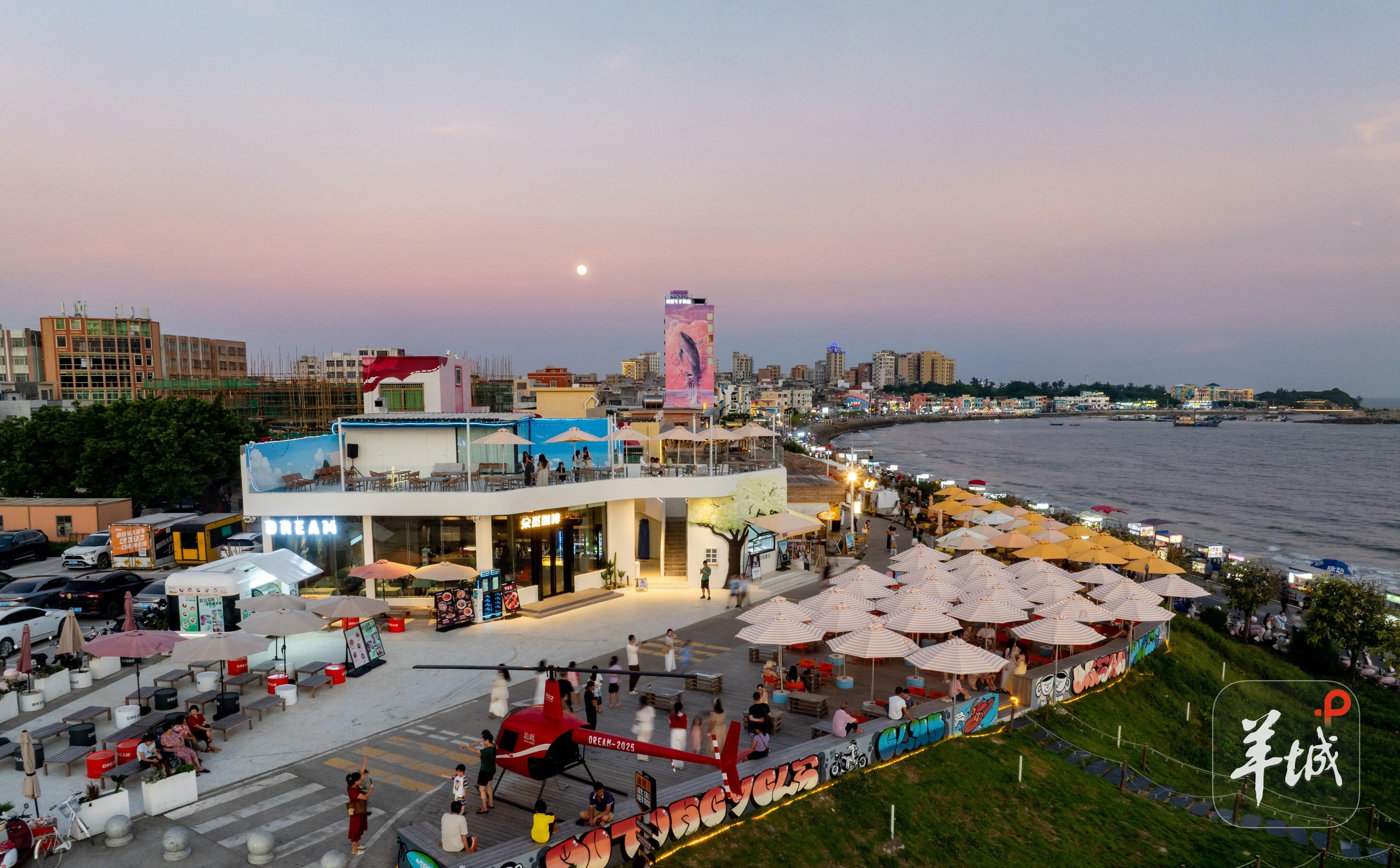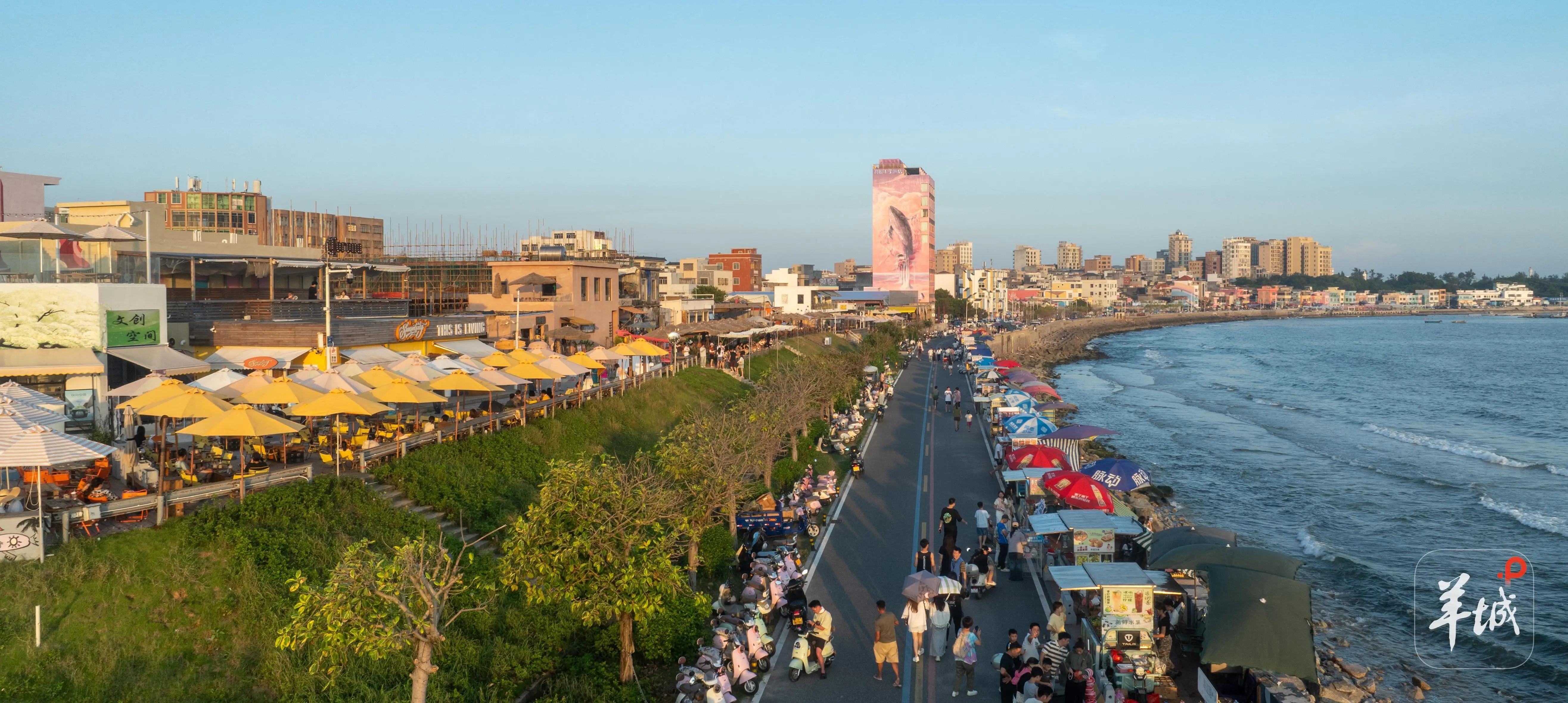 遮浪半島西海岸西北邊是咖啡一條街,這片曾閒置著近百間民居的海岸,如今成了紅海灣的「多巴胺調色盤」。沿著海邊街漫步,彷彿走進了咖啡味的顏料盒。左邊是夏威夷風情的衝浪主題咖啡店,門口立著半截衝浪板,右邊是沙漠風咖啡店,駝色的帷幔搭出遮陽棚,竟與藍色的大海形成了奇妙的反差。最引人注目的還是一座粉紅色的大樓,巨大的鯨魚甩動尾鰭濺起浪花,騰空而起,像是要沿著牆面向天空飛翔。