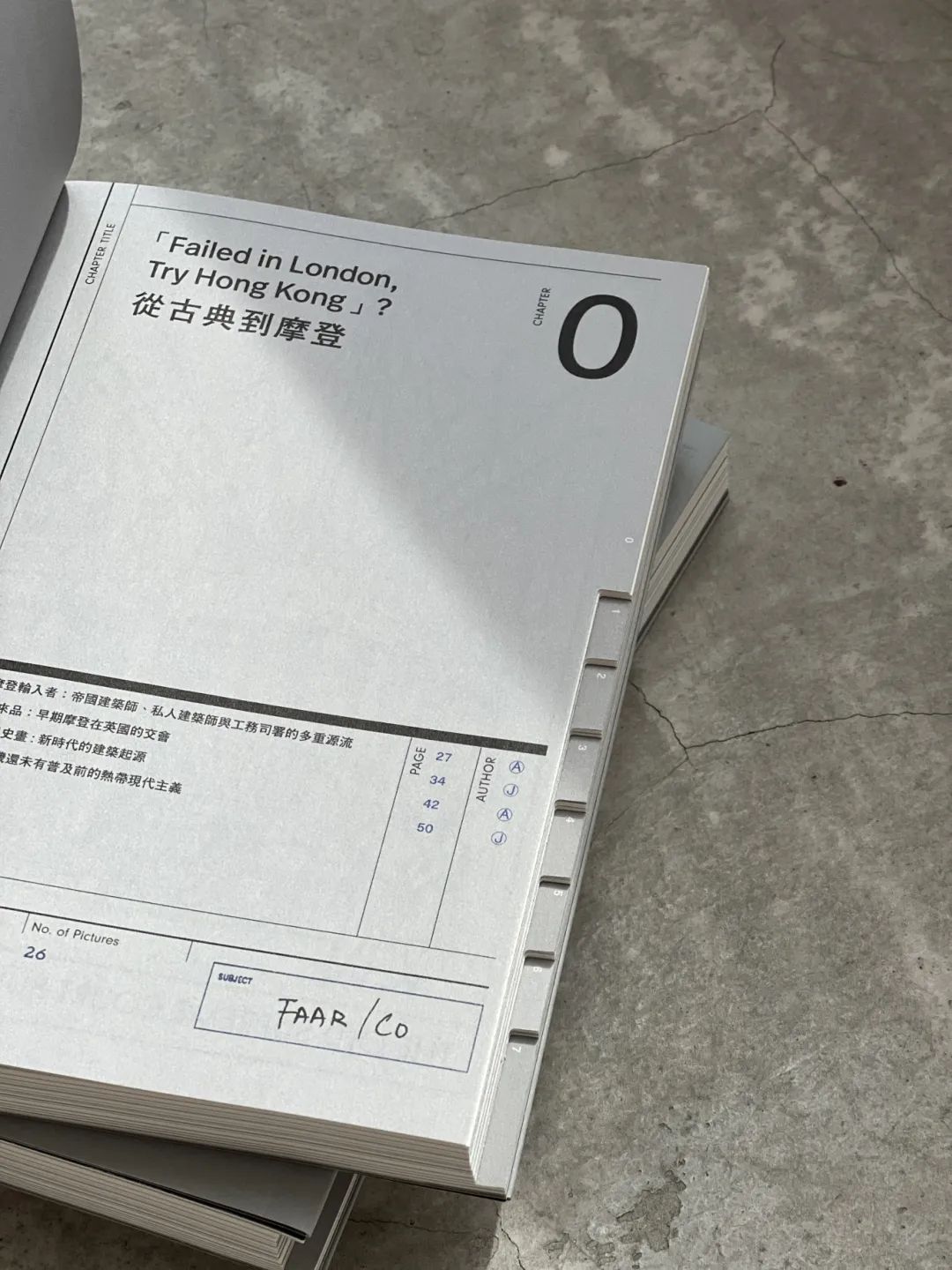 書籍以「資料夾」形式設計,翻開書本就如走進一個圖文並茂的檔案館。設計師巧妙加入許多精緻的檔案元素,其中以邊緣切割方式呈現的索引設計,既能作為章節分類指引,又能營造出有如水泥階梯般的視覺效果,令讀者感受恍如踏進建築物般的秩序感。