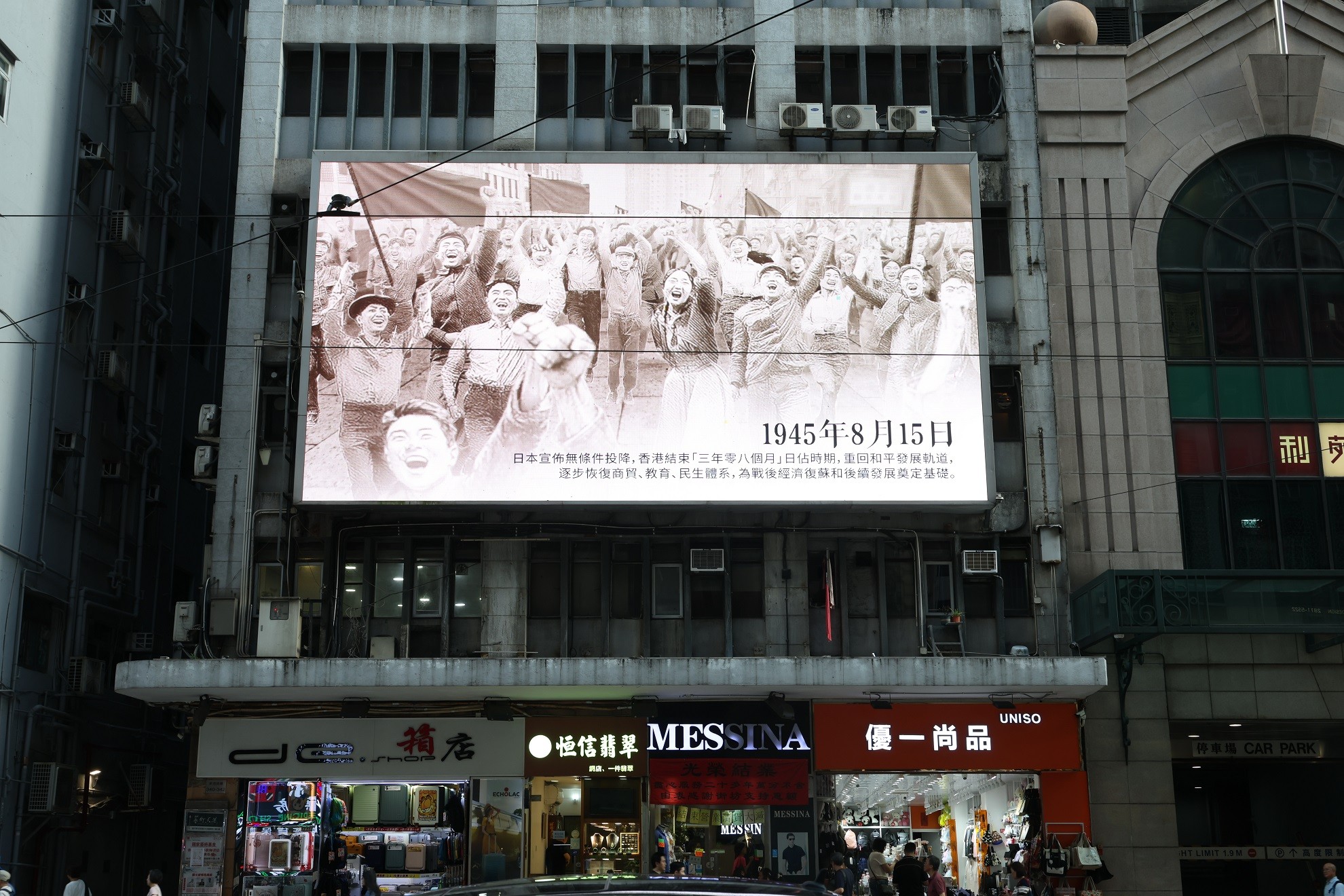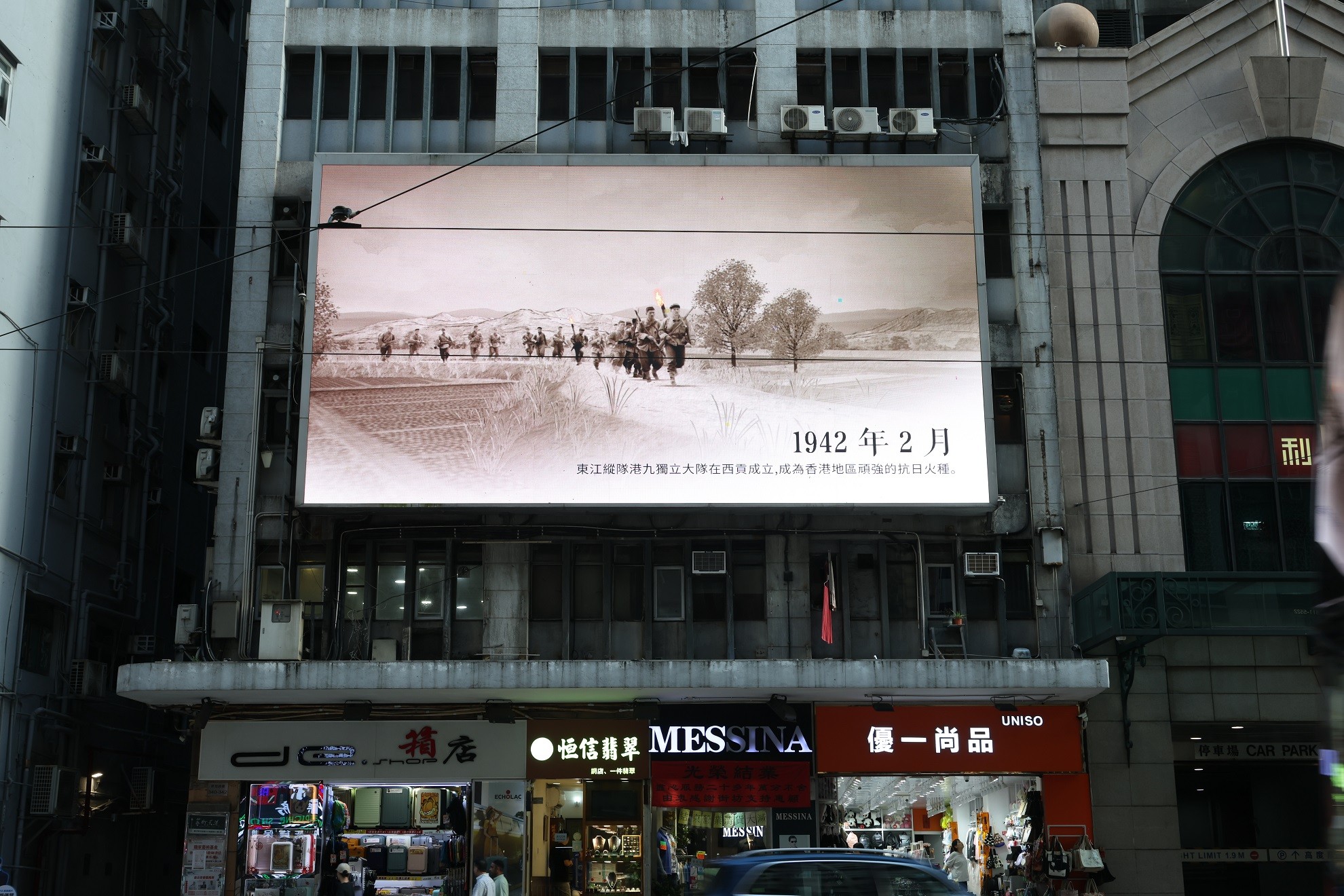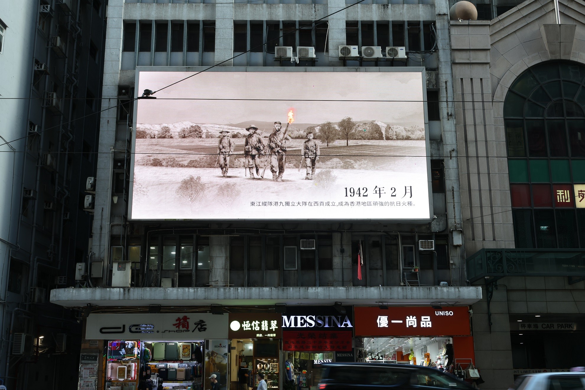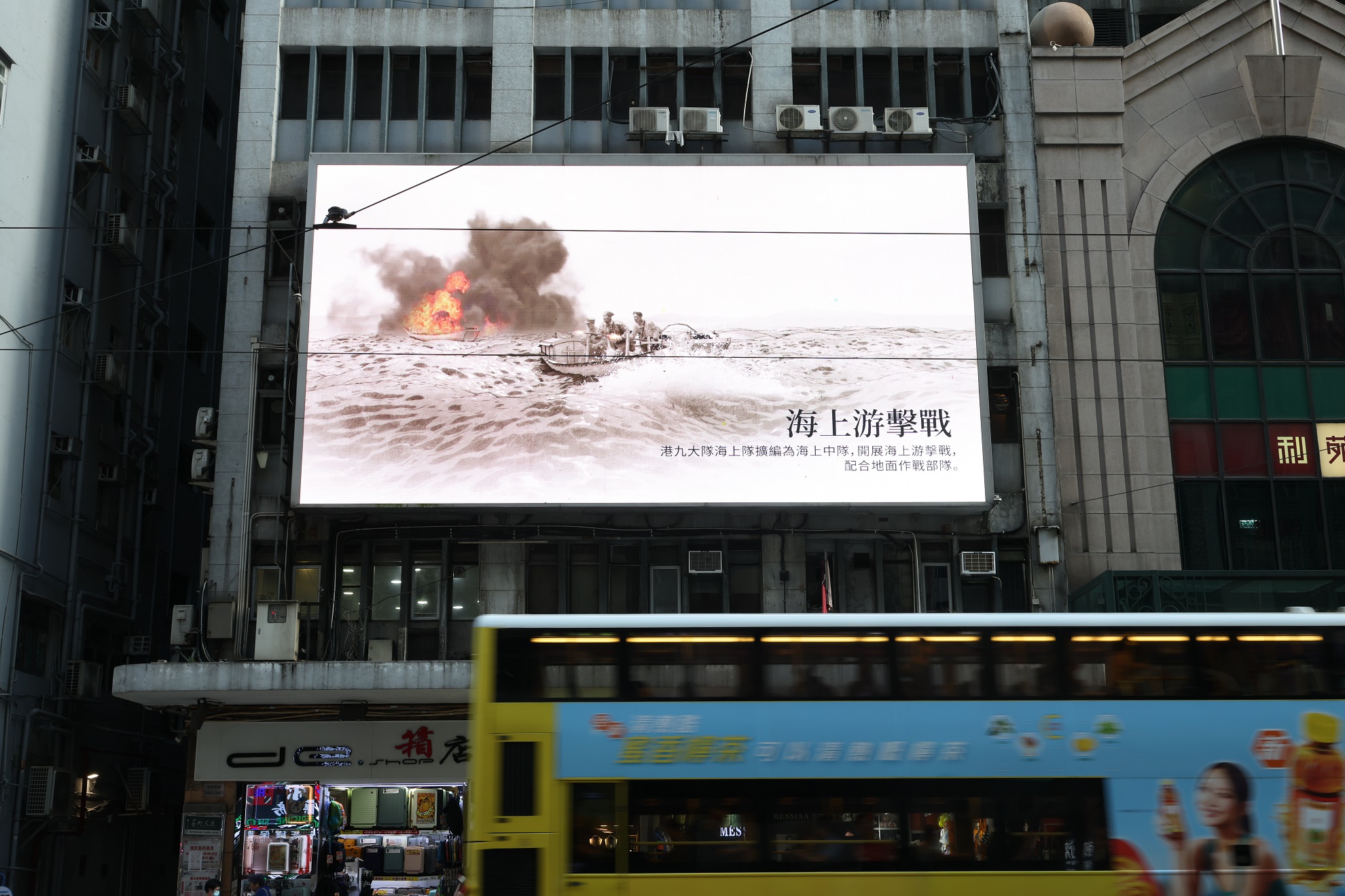 《香江烽火》在灣仔一處大熒幕播放。