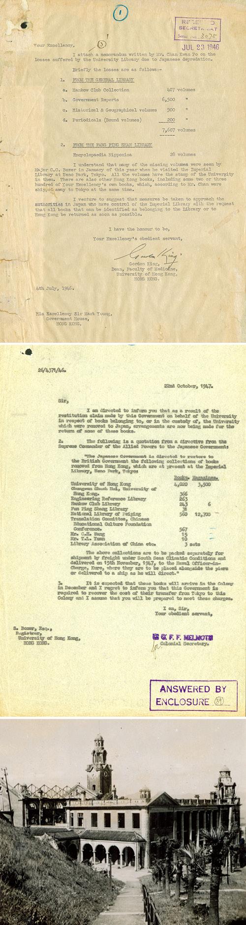 日佔時期,日軍從香港大學的圖書館掠走大量書籍,運往日本。戰後,香港大學馮平山圖書館館長陳君葆初步整理出清單,確定該校有7,600多冊藏書被日軍掠去。藏書最終在日本東京被尋回,香港政府成功討回部分書籍。