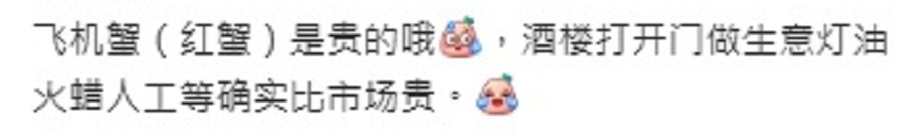 另有網民認為,店家收那個價與位處地段有關,形容該店是「高檔潮州菜」,所以「價格貴係正常」。而事主亦有回覆網民留言,堅持酒家有「呃秤」之疑,表示「一隻紅花蟹最多一公斤,是騙秤,在那個商場就是貴的但我懂。但是騙秤就不行」。