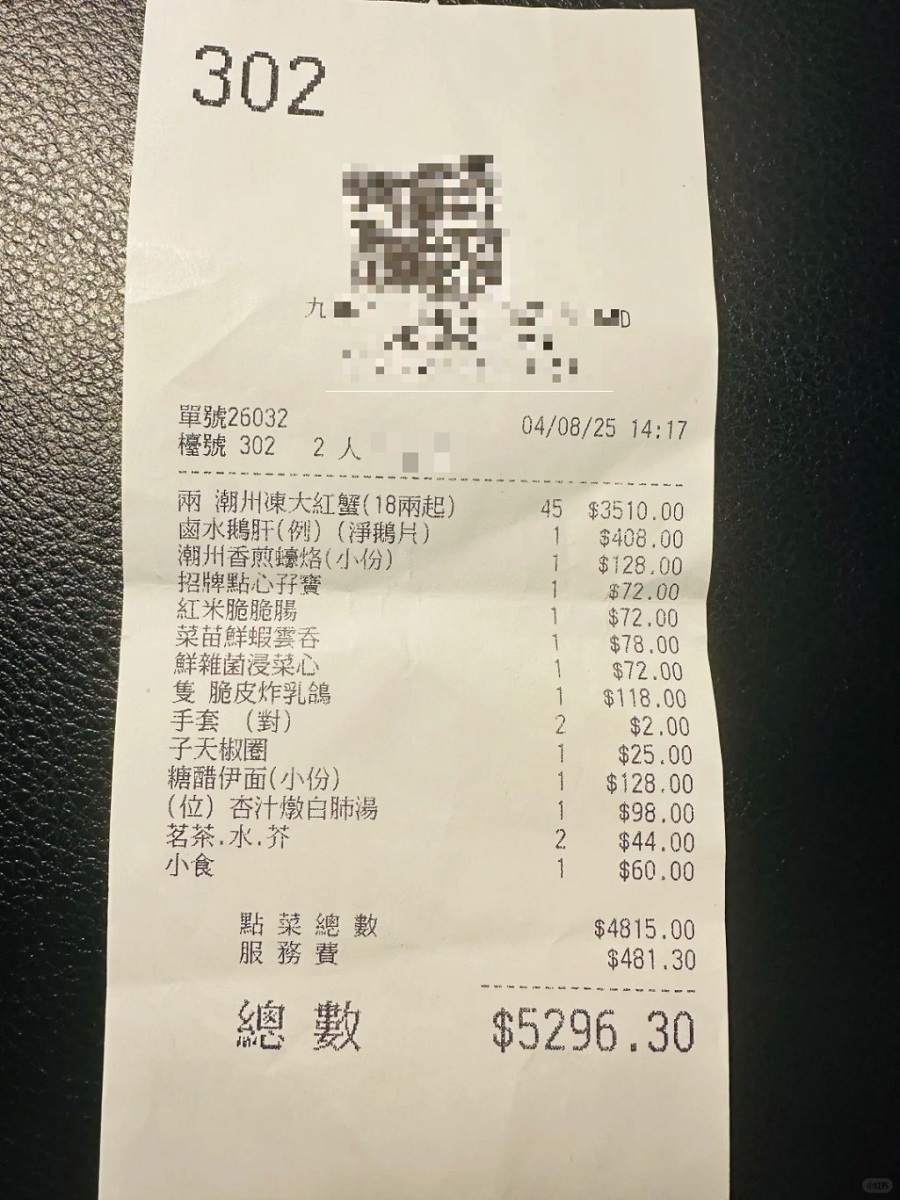樓主是一名新加坡遊客,日前在小紅書帖文,指尖沙咀一間潮洲酒家「呃秤」,並公開多張照片,其中包括來自酒樓的單據,顯示二人點了潮州凍大紅蟹、乳鴿及鹵水鵝肝等多款點心及小菜,總數為5,296.3元。當中「潮州凍大紅蟹(18兩起)」使用的紅蟹重量為45兩,售價為3,510元,即每兩約78元,佔全單金額超過6成。