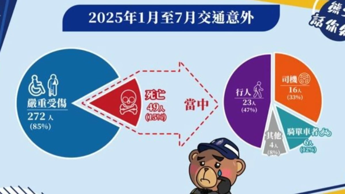另外﹐警方數字顯示,今年1至7月有288宗致命及嚴重受傷交通意外,較去年同期的548宗,下跌47%。有272人嚴重受傷及49人死亡。警方說,1至7月的致命交通意外中,23名死者是行人,較去年同期增加超過兩成。警方說,這些致命交通意外,極少數是涉及行人失誤,多數是涉及司機危險駕駛。