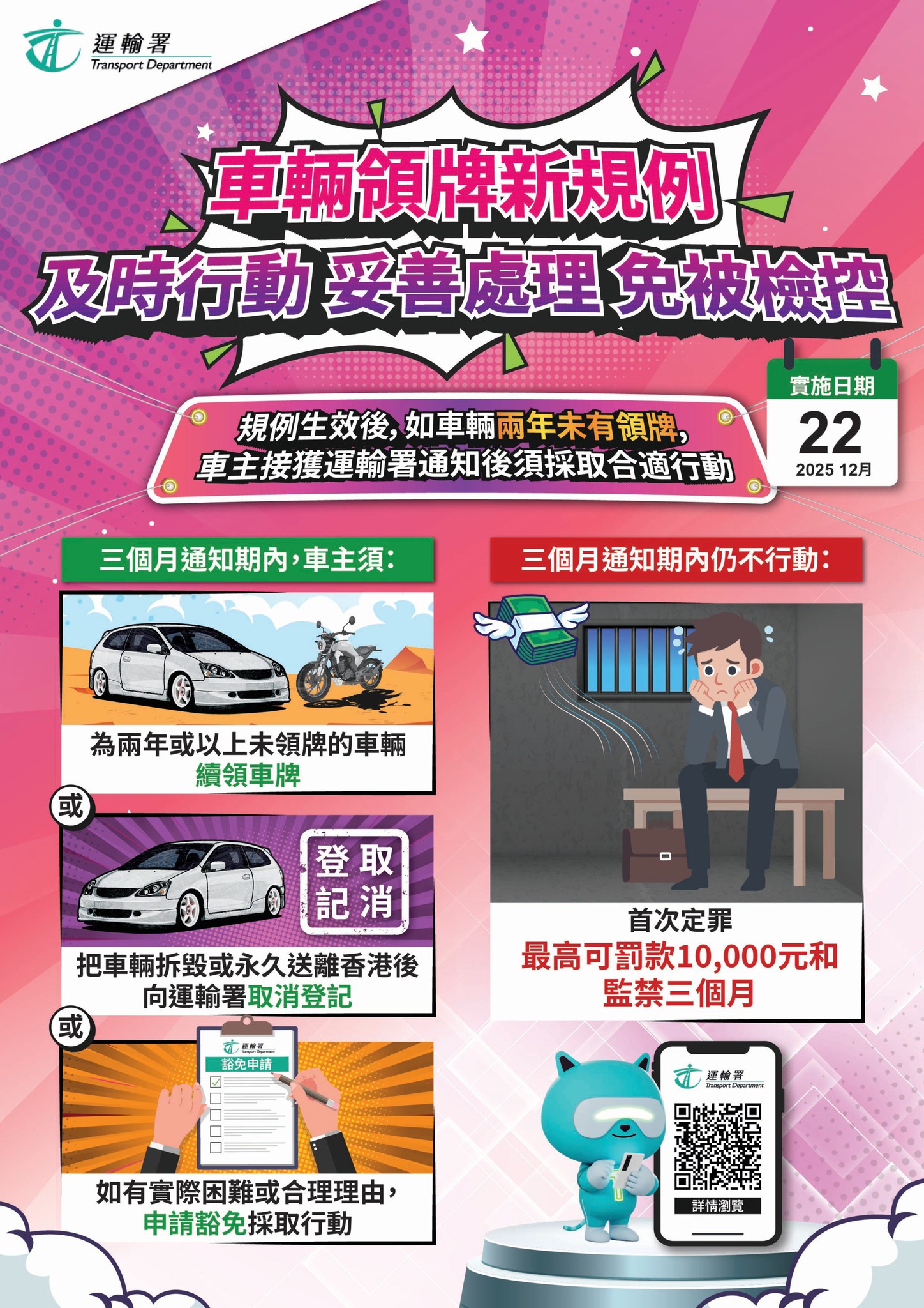 運輸署指出,如車主在三個月通知期屆滿前仍不採取行動,即屬犯罪。首次定罪最高可罰款10,000元和監禁三個月,其後每次定罪最高可罰款25,000元和監禁六個月。運輸署又指,除非車主已繳付罰款,否則署方可根據法庭命令,拒絕向被定罪車主發出或續發駕駛執照;不處理涉事車輛的過戶申請,以及拒絕向涉事車輛或被定罪車主名下其他車輛發出車輛牌照。