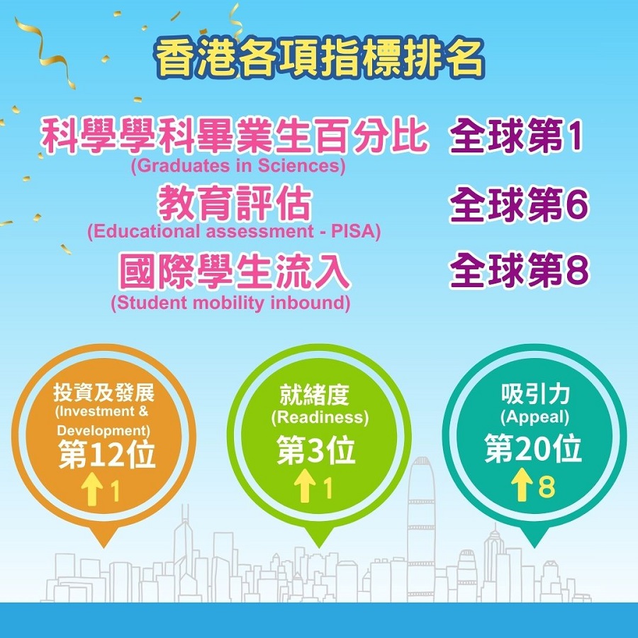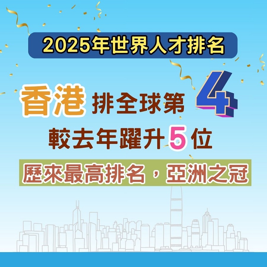 【橙訊】國際管理發展學院今天發布《2025年世界人才排名》,香港由去年的第9位,大幅躍升至第4位,是歷來最高排名,亦為亞洲之冠。教育局局長蔡若蓮在社交平台帖文指,香港在《排名》取得佳績,充分肯定特區政府近年在教育、創新科技及引進人才方面的政策方向和努力,包括成立教育、科技和人才委員會,推動教育、科技與人才一體化融合發展;並積極打造「留學香港」品牌,吸引各地優秀學子來港升學。