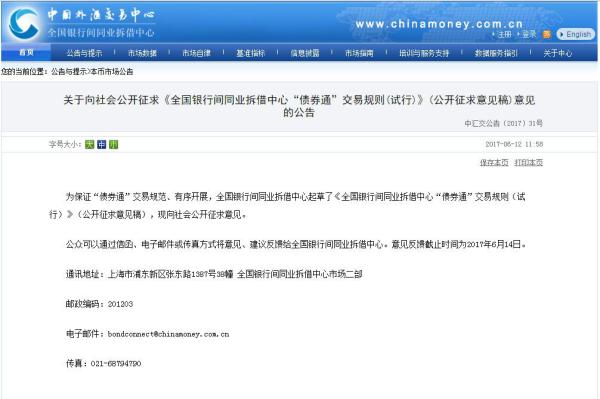 【橙訊】據內地媒體報道,中國外匯交易中心表示,為保證「債券通」交易規範、有序開展,全國銀行間同業拆借中心起草了《全國銀行間同業拆借中心「債券通」交易規則(試行)》,並向社會公開徵求意見。