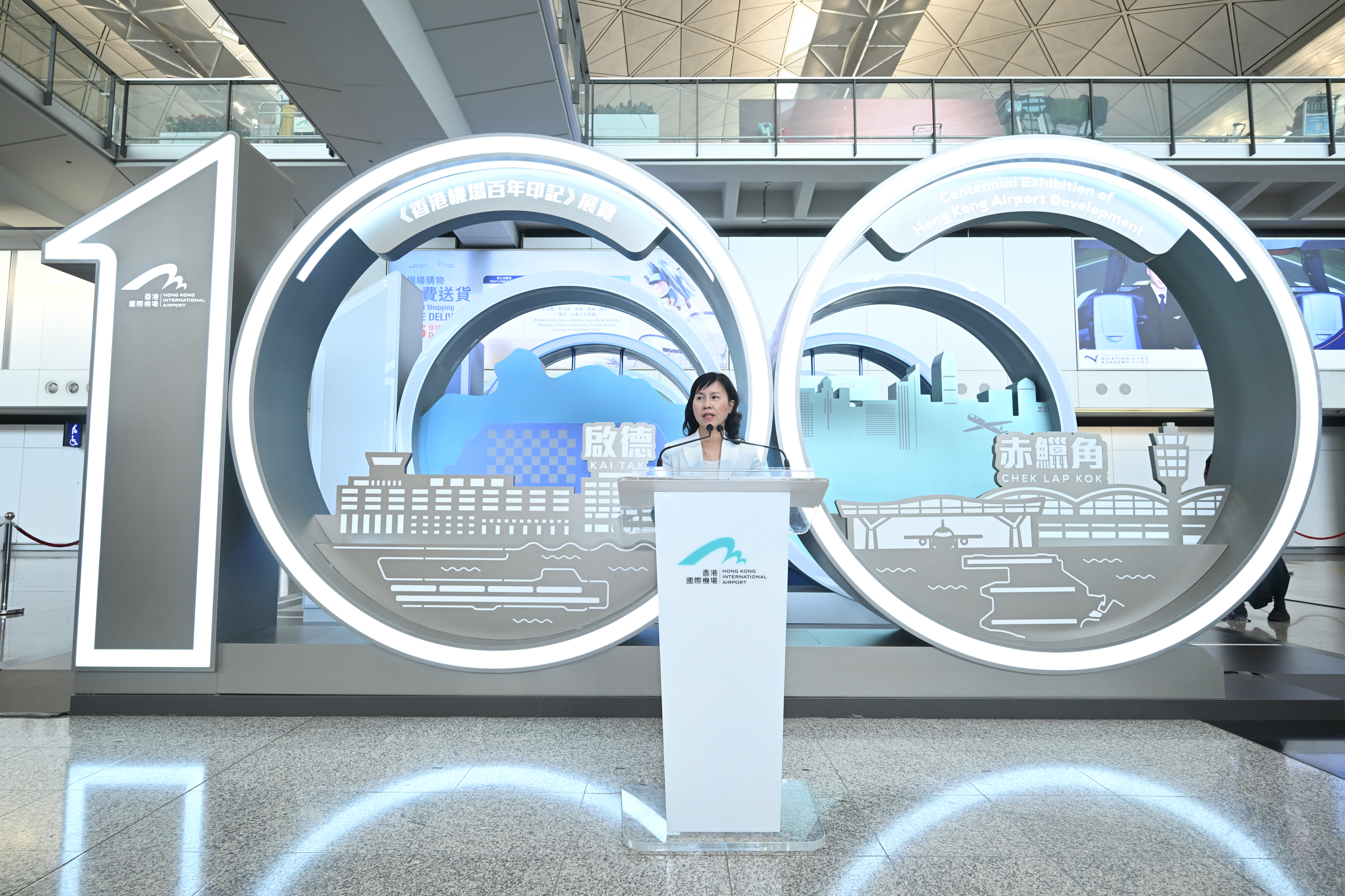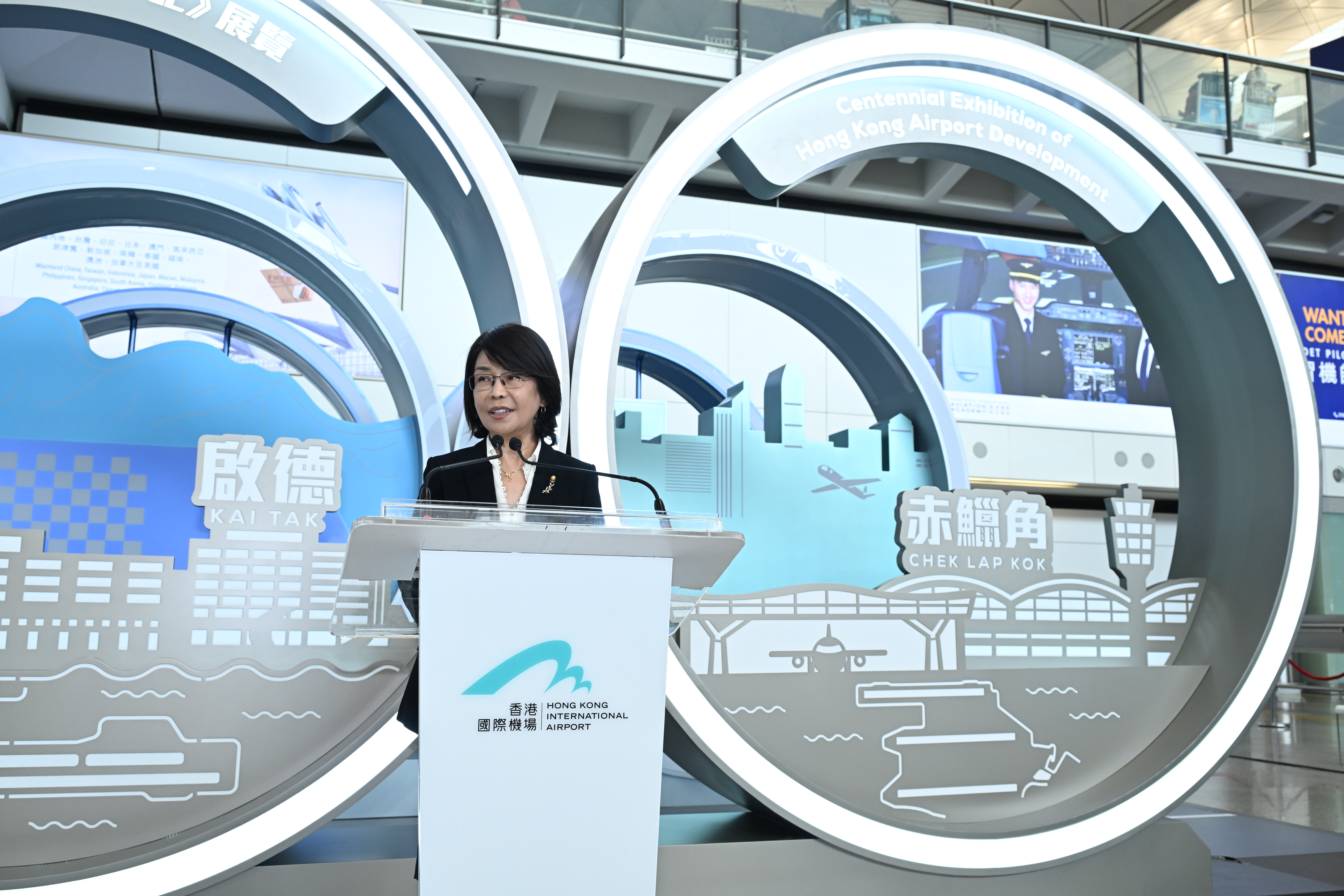 陳美寶在展覽開幕禮上致辭指,香港作為一個小漁村,發展到今日的國際航空樞紐。現時香港國際機場連接全球超過210個航點,每年招待超過5,310萬名旅客及處理490萬公噸貨物,已成為客、貨運「頂流」,亦是世界領先,使香港市民、社會每一位都引以為傲的國際機場。