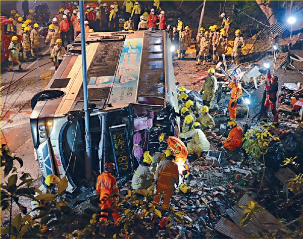 涉案巴士高速入彎落斜時失去平衡並撞向街燈及路牌,衝上行人路後向左翻側,撞斷一枝燈柱及巴士站候車亭。乘客當時尖叫並因衝力而撞至飛起,案發現場四周滿佈鮮血,其中60歲女死者劉美蓮的頭部近乎完全脫離其身體,61歲男死者鄭帶勝及62歲女死者陳賢妹的頭部被撞碎及變形,馬報浸血碎亂在地,地上亦有腦組織、人肉、斷腳、斷指。