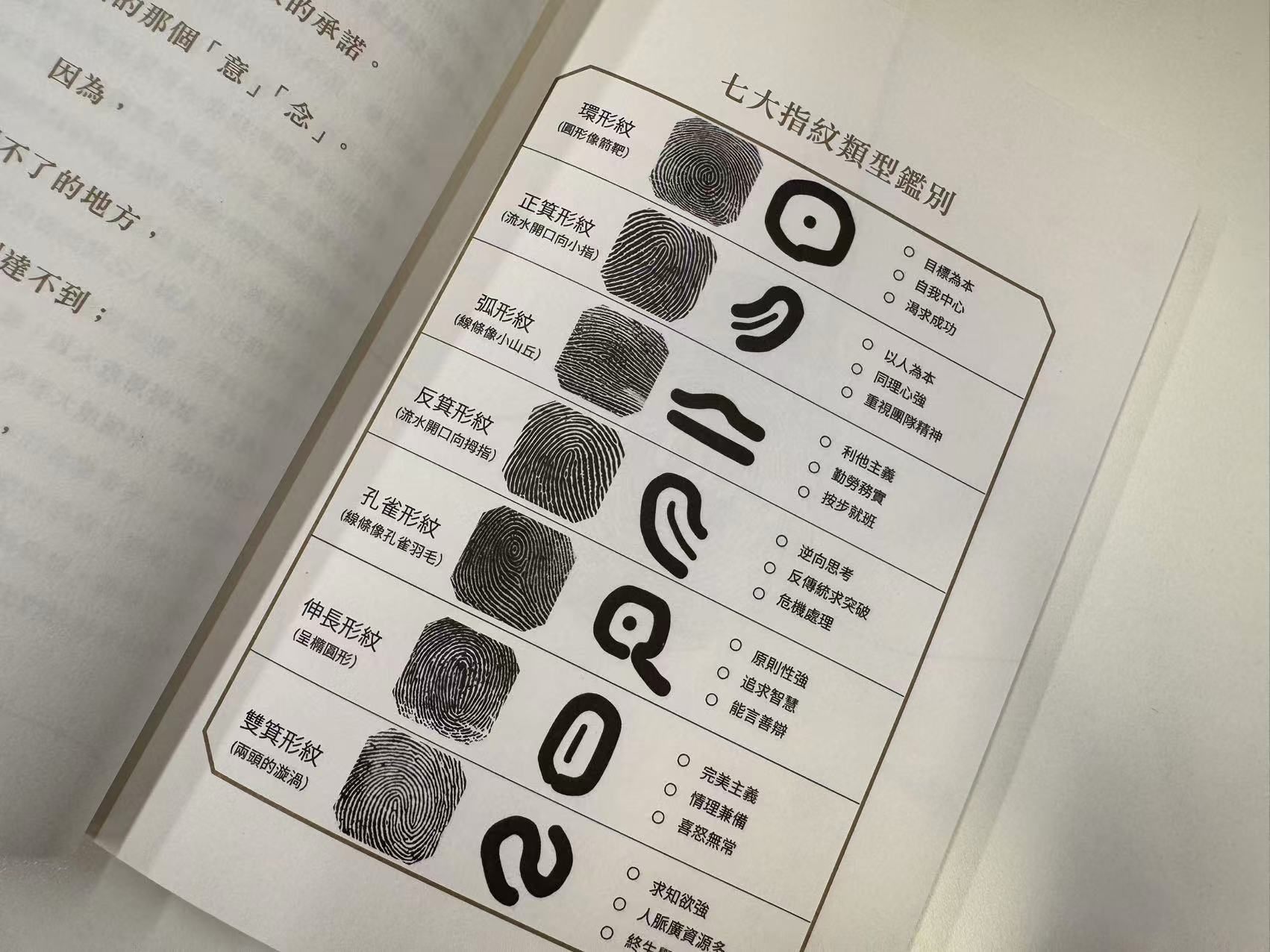 書中將指紋分為環形紋、正箕形紋、弧形紋、反箕形紋、孔雀形紋、伸長形紋和雙箕形紋七大類型,透過每種類型的指紋,都能看出「主人」的不同個性。