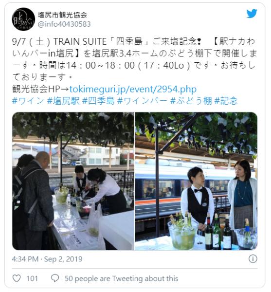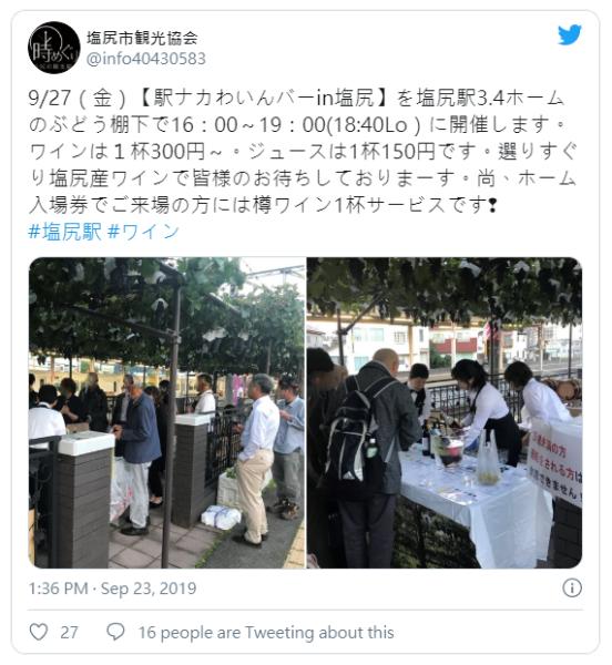 但這個火車站葡萄園不僅種植葡萄,每年9月份更會在酒吧平台的陰涼處舉辦葡萄酒活動,展示Shiojiri這款葡萄酒,當中持車票的通勤者可免費享用,至於非通勤者亦可以140日月購買到月台的車票,並獲一杯葡萄酒,惟現今新冠肺炎疫情嚴峻,未知能否如期在9月秋季再搞活動。