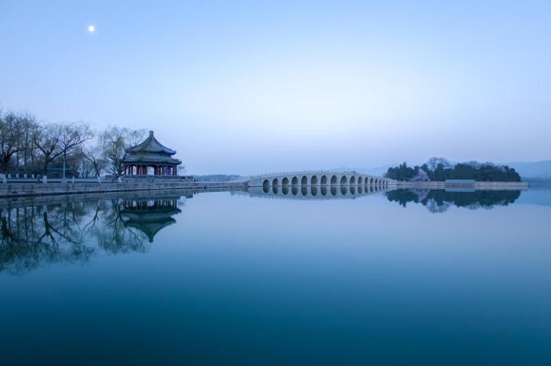 水曲由岸,水隔因堤,故頤和園以長堤分隔,斯景始出,而橋式之多,構圖之美,處處畫本。若玉帶橋之瑩潔柔和,十七孔橋之彷彿垂虹,每當山橫春靄,新柳拂水,遊人泛舟,所得之景與陸上得之景,分明異趣。而處處皆能映西山入園,足證「借景」之妙。