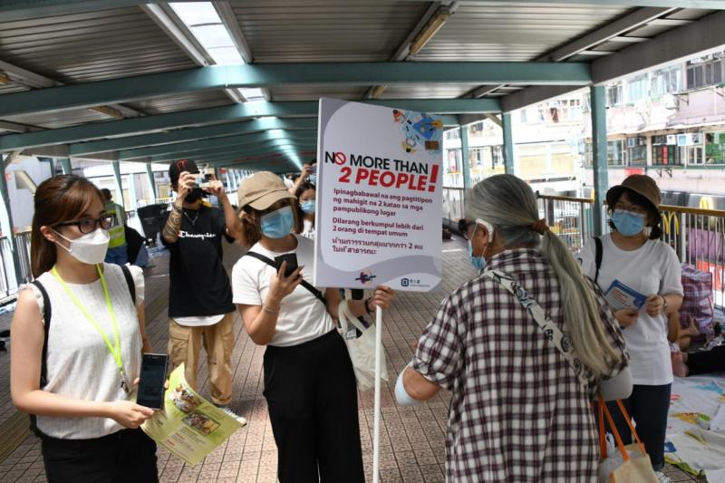在旺角道行人天橋,聚集的外傭人數較昨日多,包括特務警察在內的人員在場派發傳單,呼籲外傭們遵守限聚令及佩戴口罩。