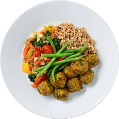 素食者最愛的「素菜丸伴藜麥、四季豆及番茄燴雜菜」(外賣自取$ 19.5;堂食價$23)。