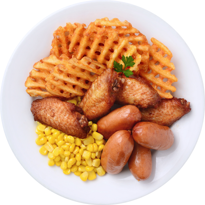 下午茶輕食之選推薦豐盛的「小食拼盤」(外賣自取$36.5;堂食價$43),一碟包括了煙燻蜜糖腸及脆炸黃金雞翼各4件,香脆薯格及甜粟米。