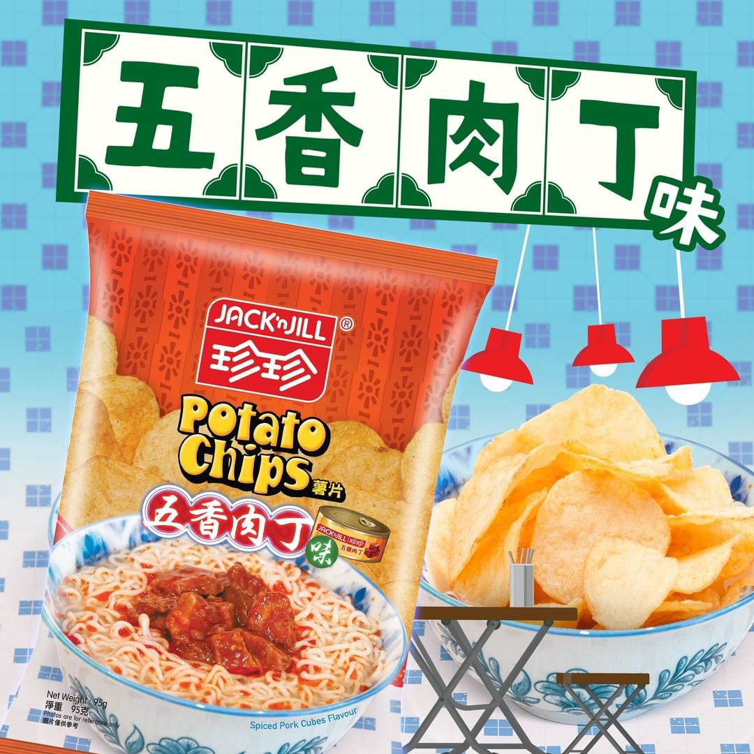 五香肉丁麵是不少香港人的茶餐廳食物之選,珍珍全迎推出的「五香肉丁味薯片」,巧妙地將五香粉及秘製辣椒粉加入薄脆薯片,令你每一口都品嚐到濃厚的肉丁香氣,惹味吸引,讓人食到停不了口。