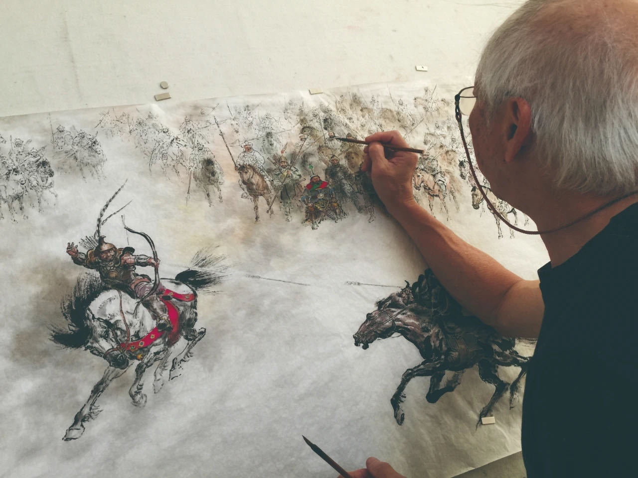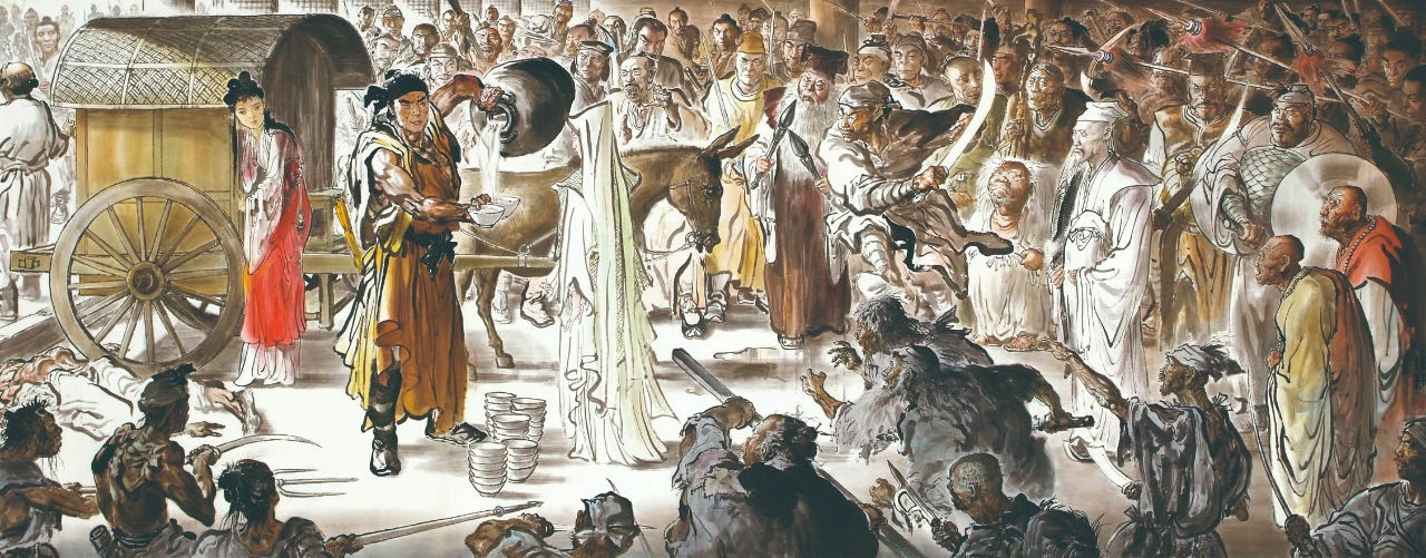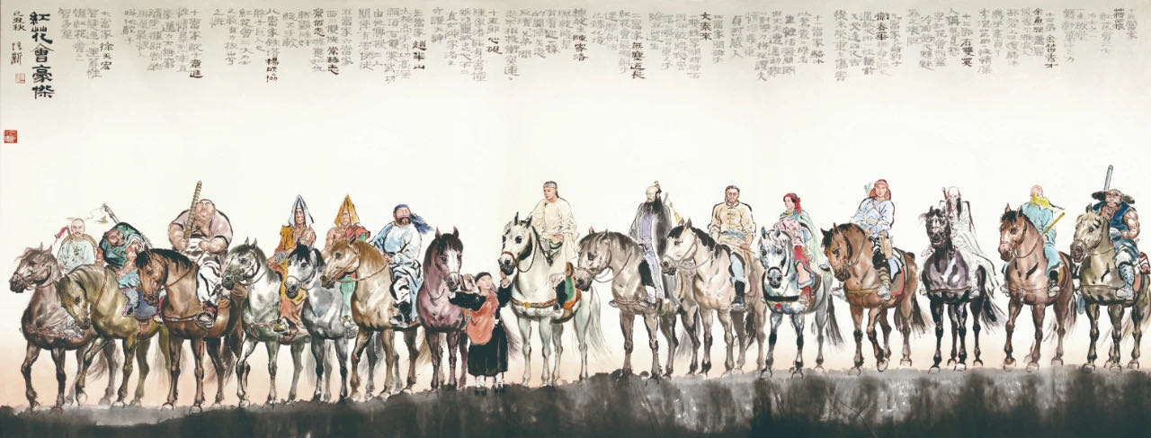 紅花會一幫人去追張召重,小說沒有描寫出發的情景,這是我構思出來的,因為我畫的時候,用了一張十二尺闊的畫紙,把十五個人一字形橫排,會做成一個很大的壓逼感,小說內對這十五人的描述,完全獨立處理,每一個人沒有絲毫相似之處,所以我加了一些東西,十五隻馬全部畫成不同模樣。