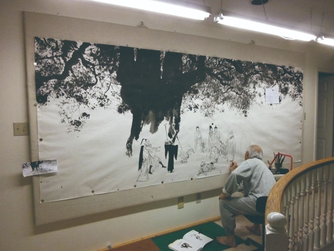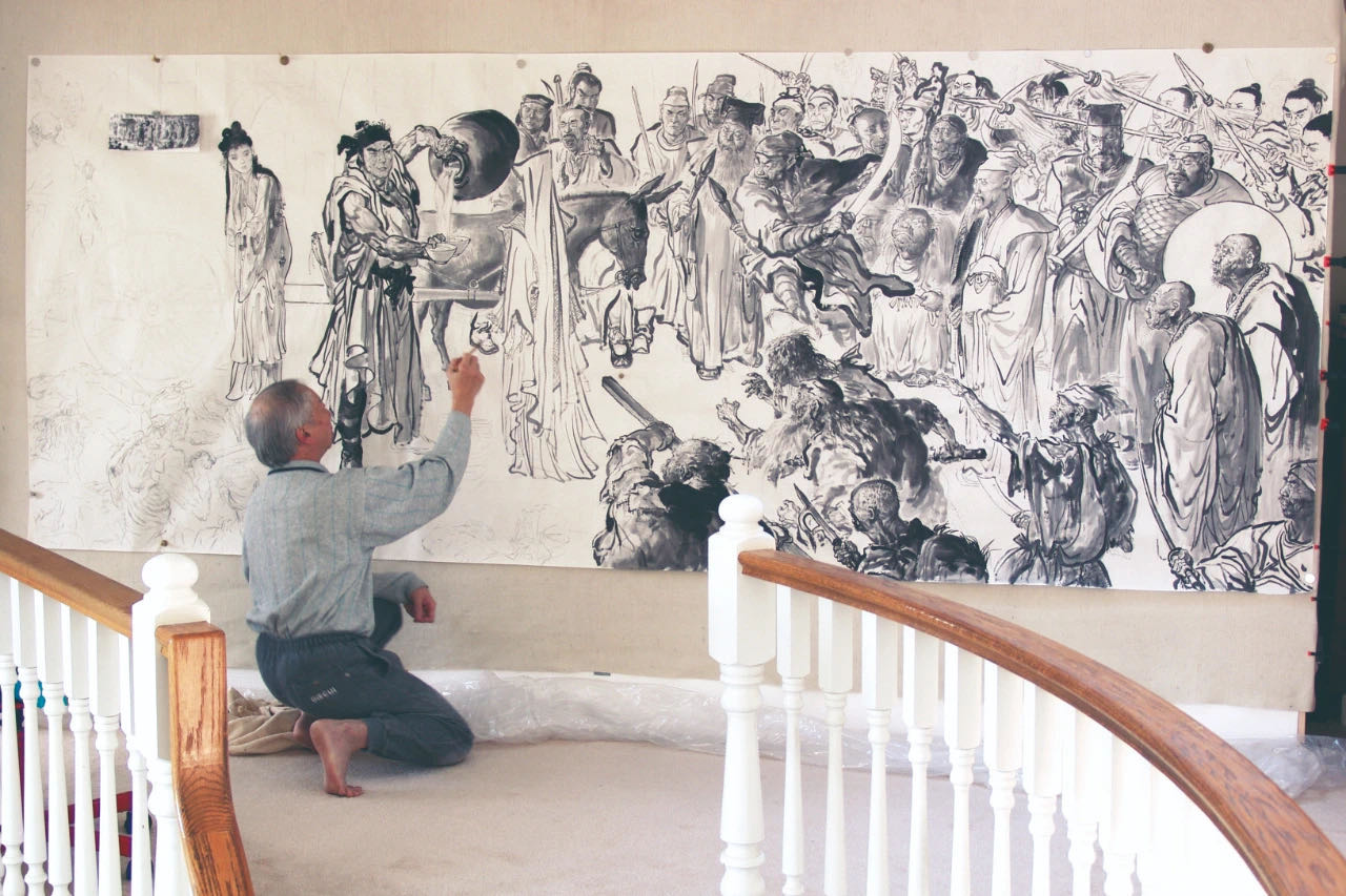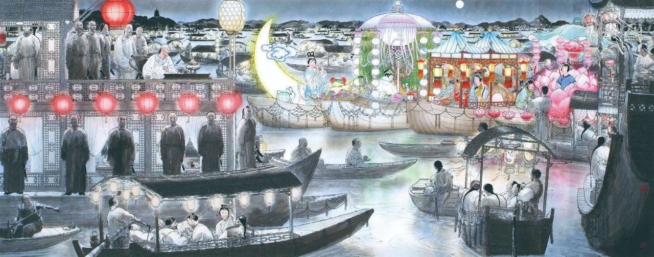 很多人喜歡乾隆在西湖選妓這張畫,其實我在最後階段,十二尺畫布都畫好,上顏色後,我幾乎想放棄。作畫的時候一定要忠於小說,小說作者寫的時候,很主觀、概略地寫,但我在處理光暗與顏色時,我要忠於原著。