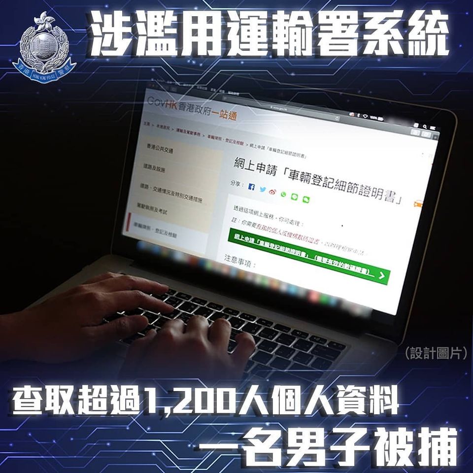 網絡安全及科技罪案調查科前日下午在屯門拘捕涉案疑人,檢獲三部手機及一部電腦,相信他自去年6月起受他人指使,在運輸署網上申請「車輛登記細節證明書」系統,申請逾1200百份證明書。在申請過程中,他訛稱所獲取的證明書是用作法律訴訟及買賣車輛用途。證明書上面載有不同的個人資料,包括車牌號碼、車輛登記資料、車主姓名、住址及身份證號碼。
