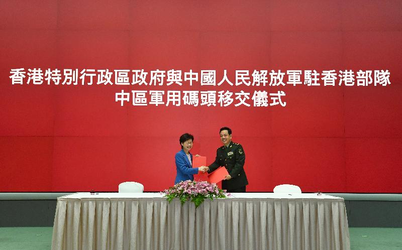 行政長官林鄭月娥(左)與香港駐軍司令員陳道祥少將交換《中區軍用碼頭移交備忘錄》。圖:政府新聞處