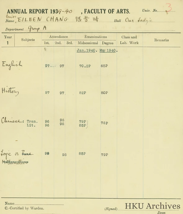 據港大表示,張愛玲是不缺課的學生,考勤幾乎完美。在學籍紀錄上的證件照裡,她穿著深色旗袍和深色針織外衣,戴著圓圓的眼鏡片,含著微笑,是即將從上海聖瑪利亞女中畢業的高中生模樣。