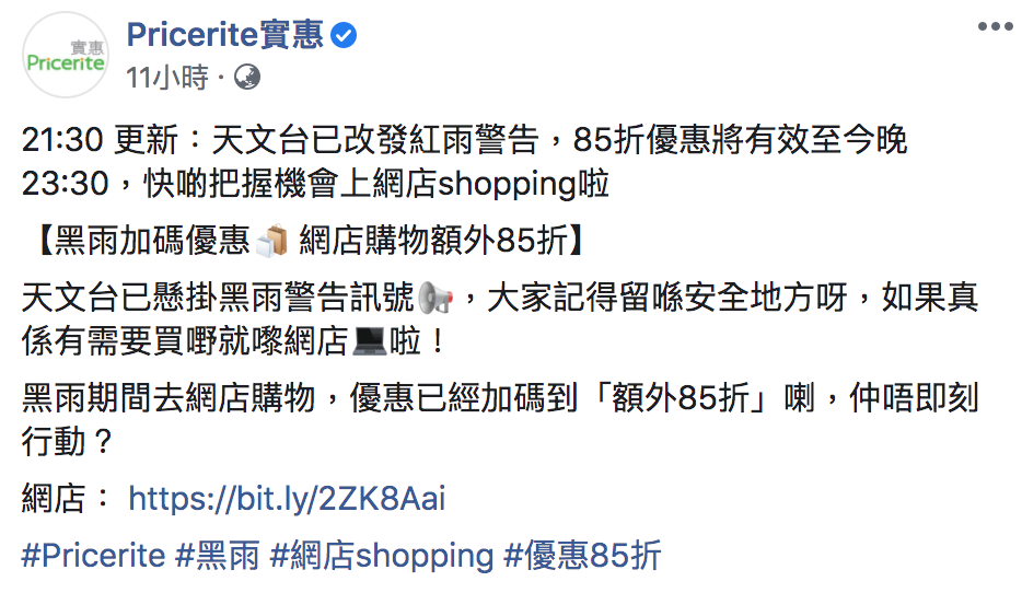 黑雨警告生效後,實惠小編的反應相當快,不出十分鐘已在Facebook出圖發文,指在黑雨警告懸掛期間至晚上11時30分止,推出網店限時額外85折優惠。天氣變幻莫測,難以提前掌握暴雨信號的時間,實惠小編當晚亦實時更新專頁,跟進天文台於9時25分改發紅雨警告。