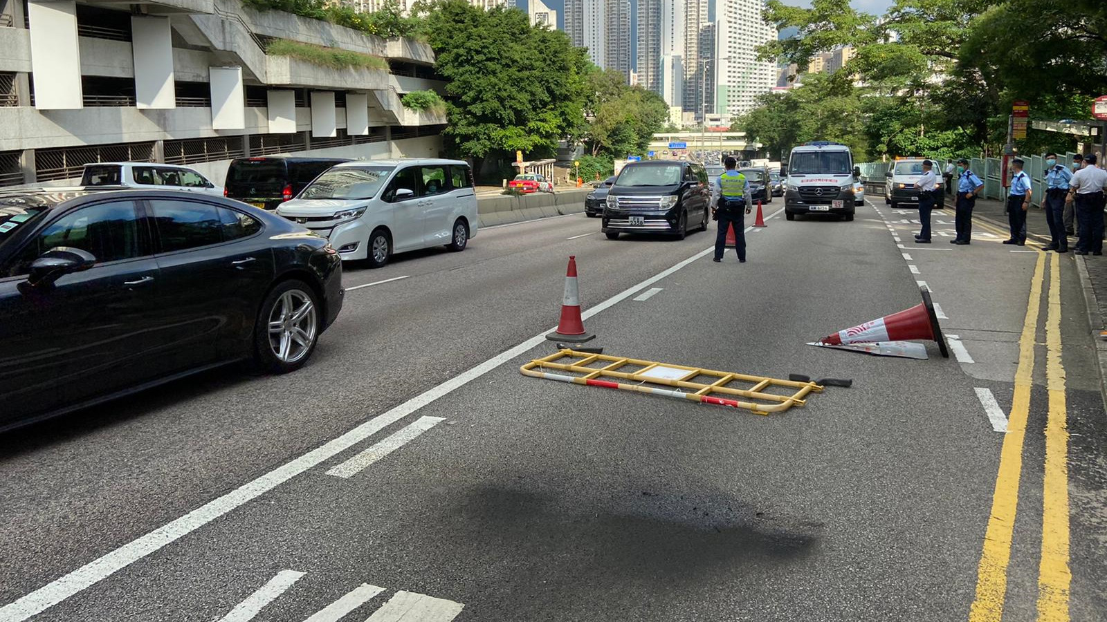 【橙訊】警方表示,下午三時許有市民目擊兩名男子在黃大仙天馬苑附近,向龍翔道投擲汽油彈及大型雜物。警方接報到場處理,發現涉事路段遺下被火焰熏黑的痕跡、圍欄及雪糕筒。