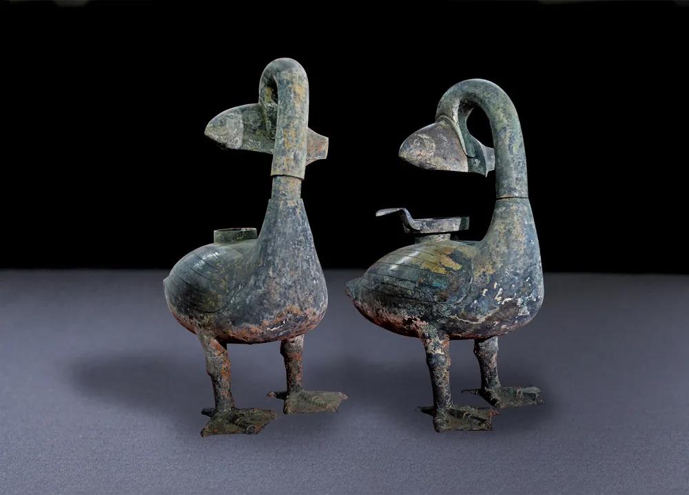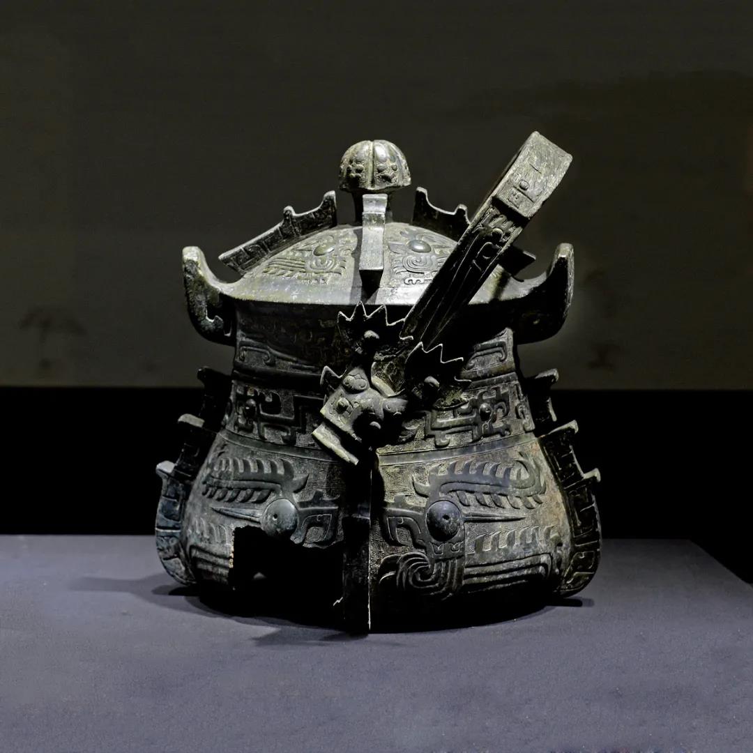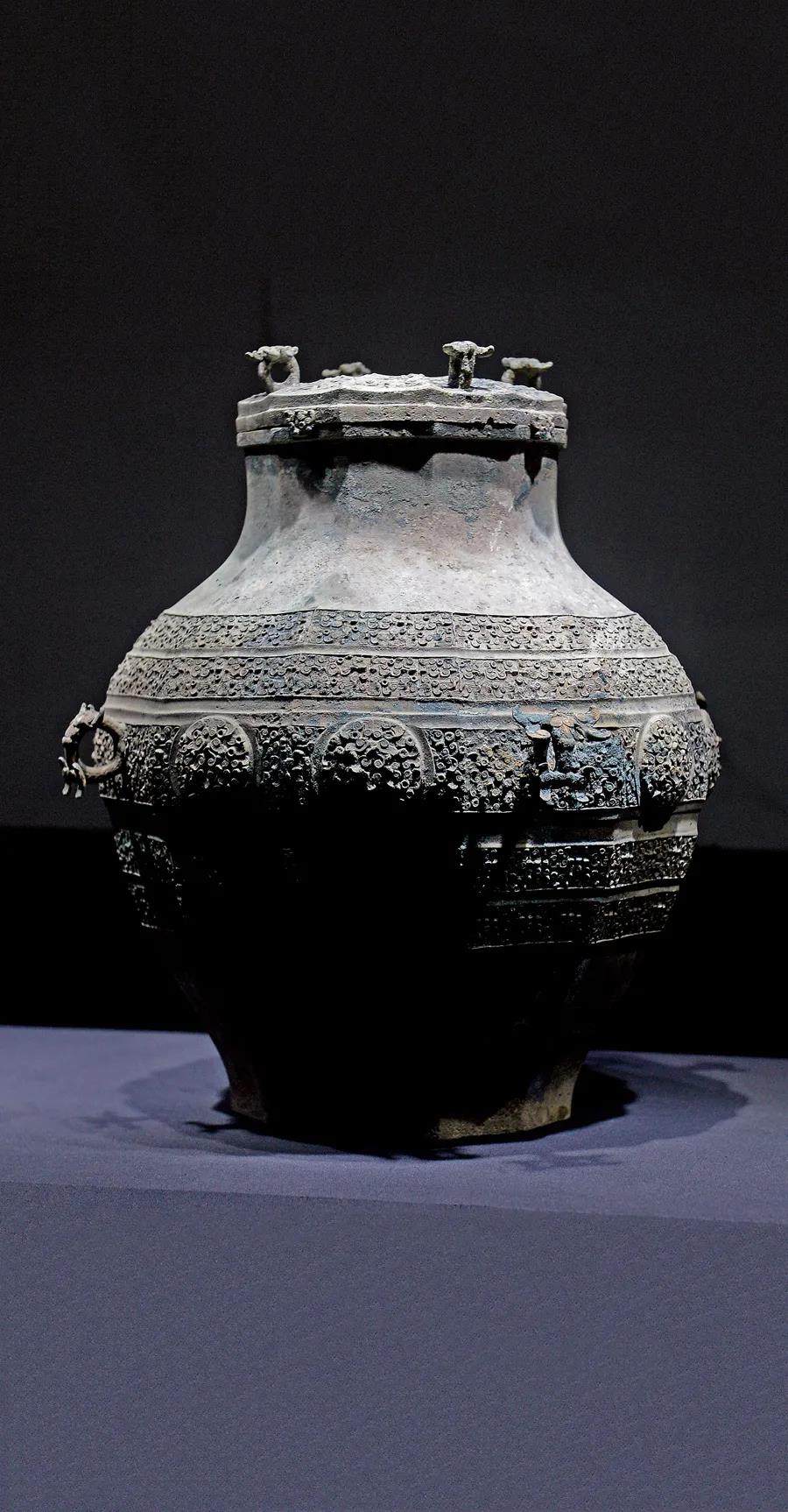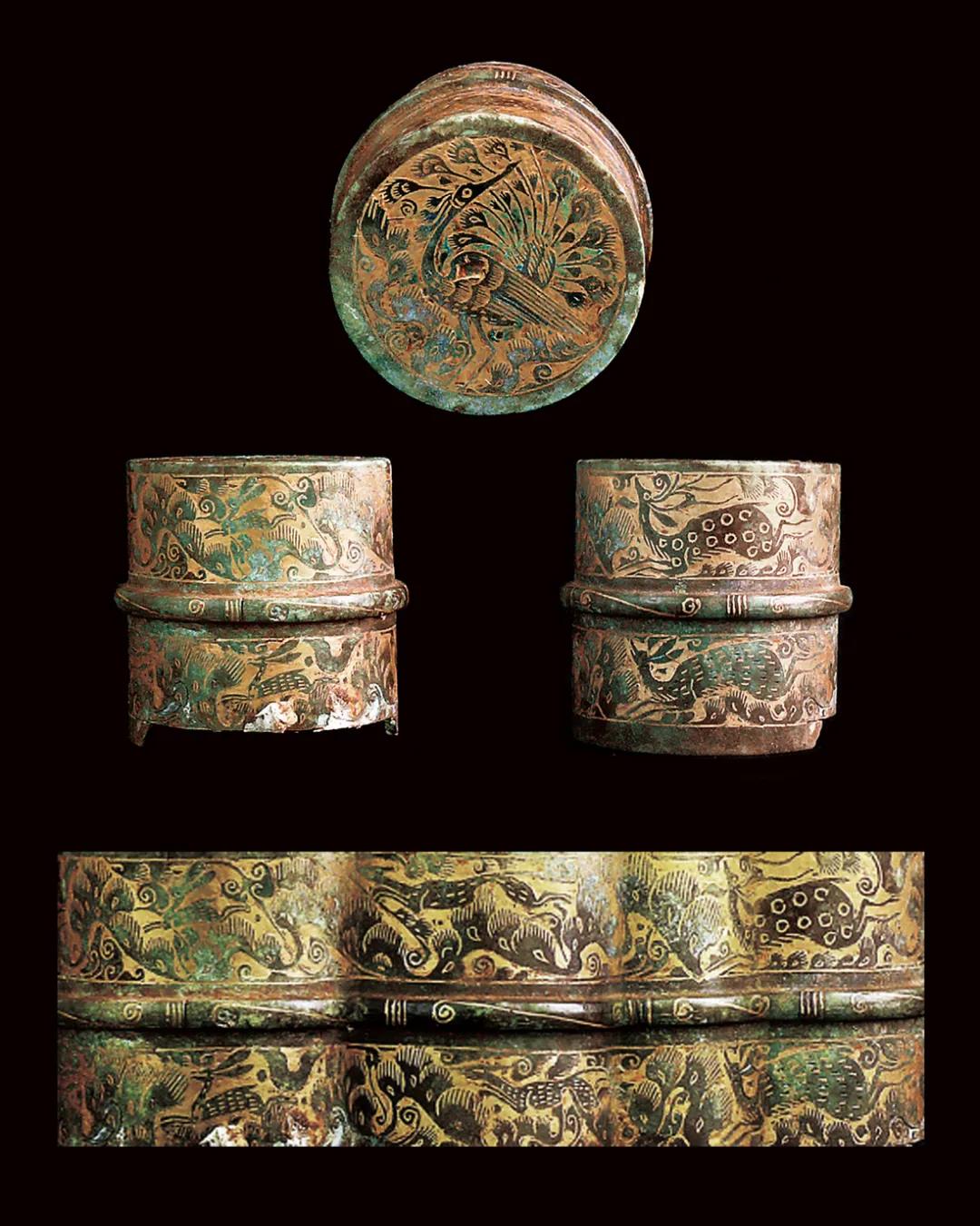 青銅缶是東周時酒器,蓋子可以打開,這件器物以「失蠟法」製成,代表了中國當時青銅工藝的最高水平。當是墓主生前珍藏。