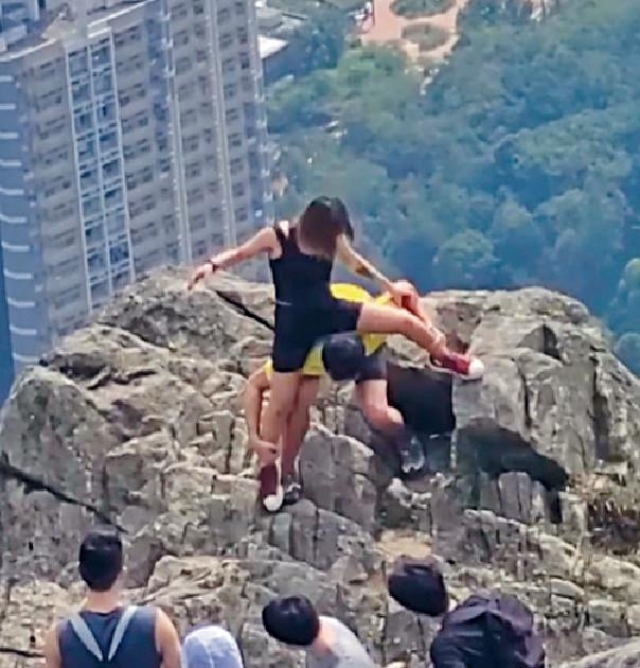 【橙訊】飛鵝山自殺崖是行山客「打卡」熱點,日前有一群年輕行山客登山,途經自殺崖附近的懸崖峭壁,一對疑似情侶在崖邊玩騎膊馬拍照,片段近日在網上瘋傳,惹起網民熱議,不少人指摘兩人玩命,隨時害己害人。
