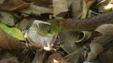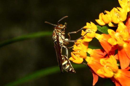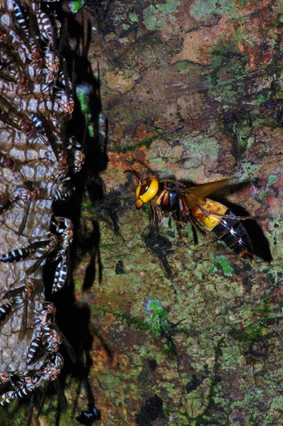 有一天,一隻孔武有力的黃紋大胡蜂,飛入元墩下祠堂對下燕岩溪畔密林,來到叉胸側異腹胡蜂像張紙那樣的蜂巢前,跟前文的熱帶胡蜂一樣,伺機掠奪其蜂蛹幼兒。牠耀舞揚威的架勢被我照到。