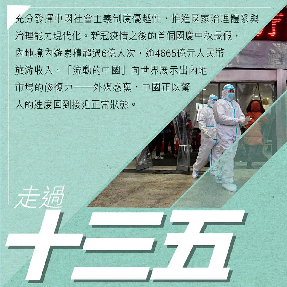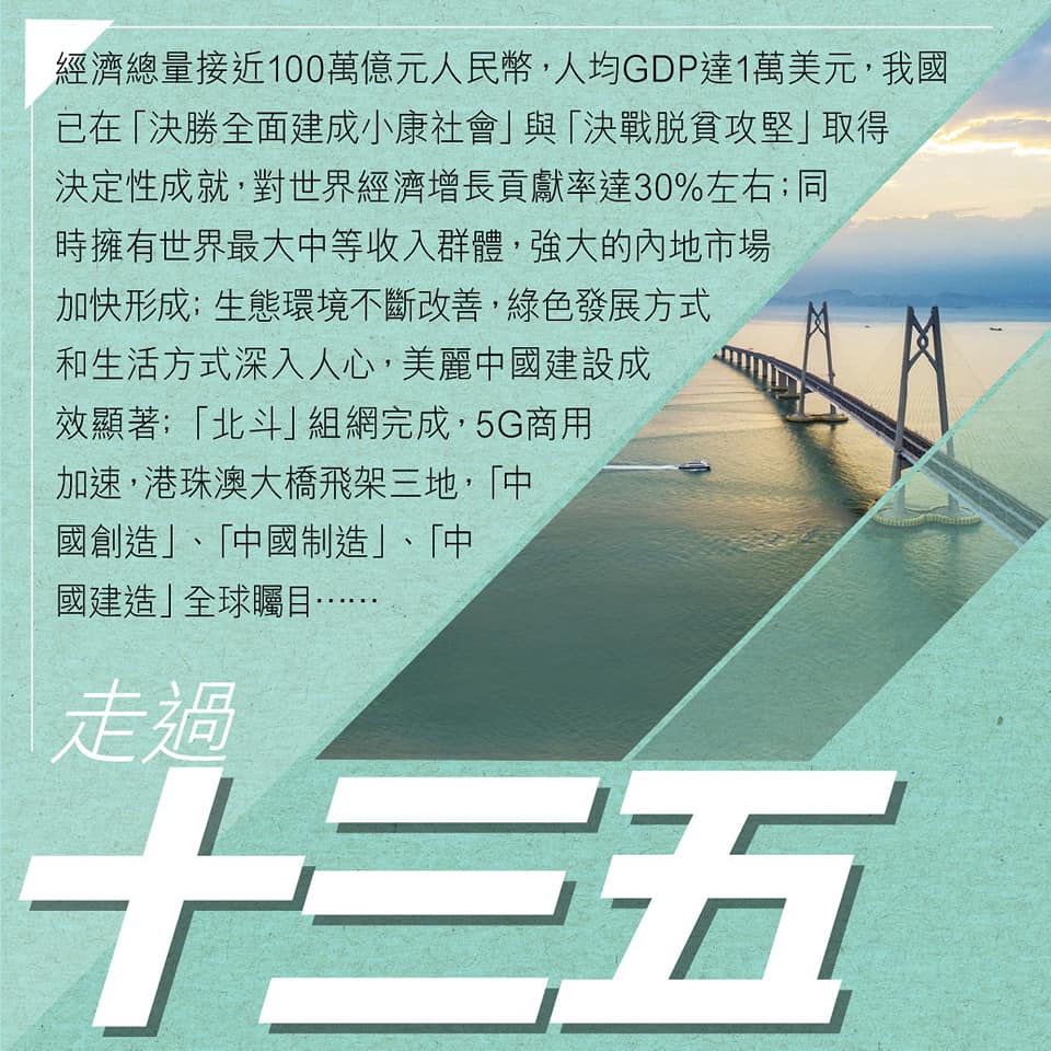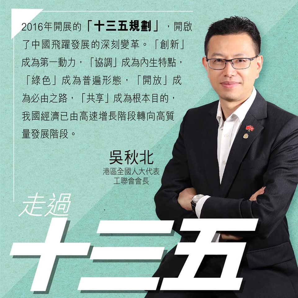 港區全國人大代表、工聯會會長吳秋北在facebook貼圖先回顧了我國「十三五」的成就,他發文稱,「『十四五』建議出來了,就先檢點一下『十三五』的驕人成就,『溫故知新』,這樣將更好理解『十四五』的偉大!期間香港定能保持長期繁榮穩定,為國家深化改革開放作貢獻!香港再出發!」他說,明天再談「十四五」。