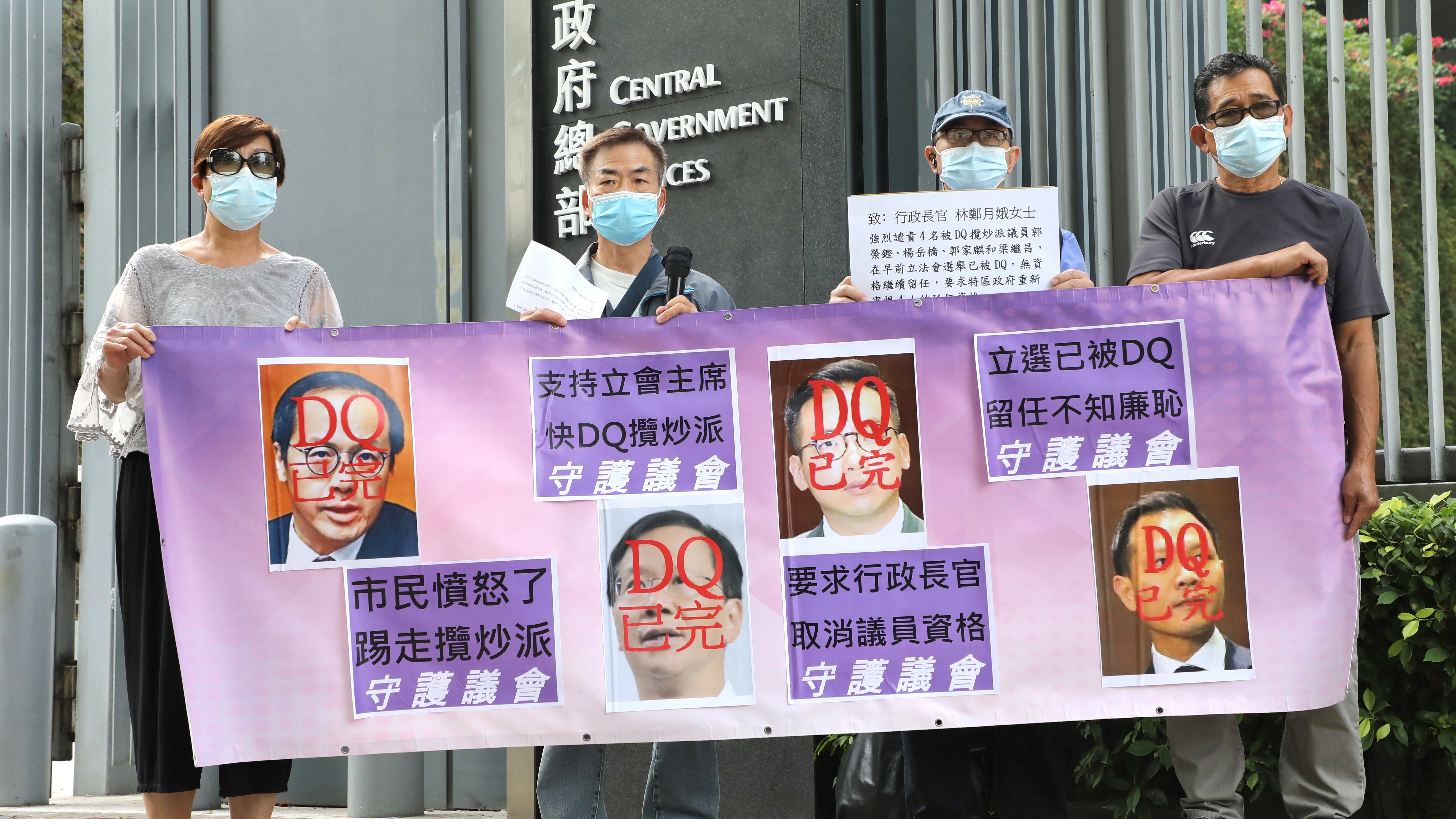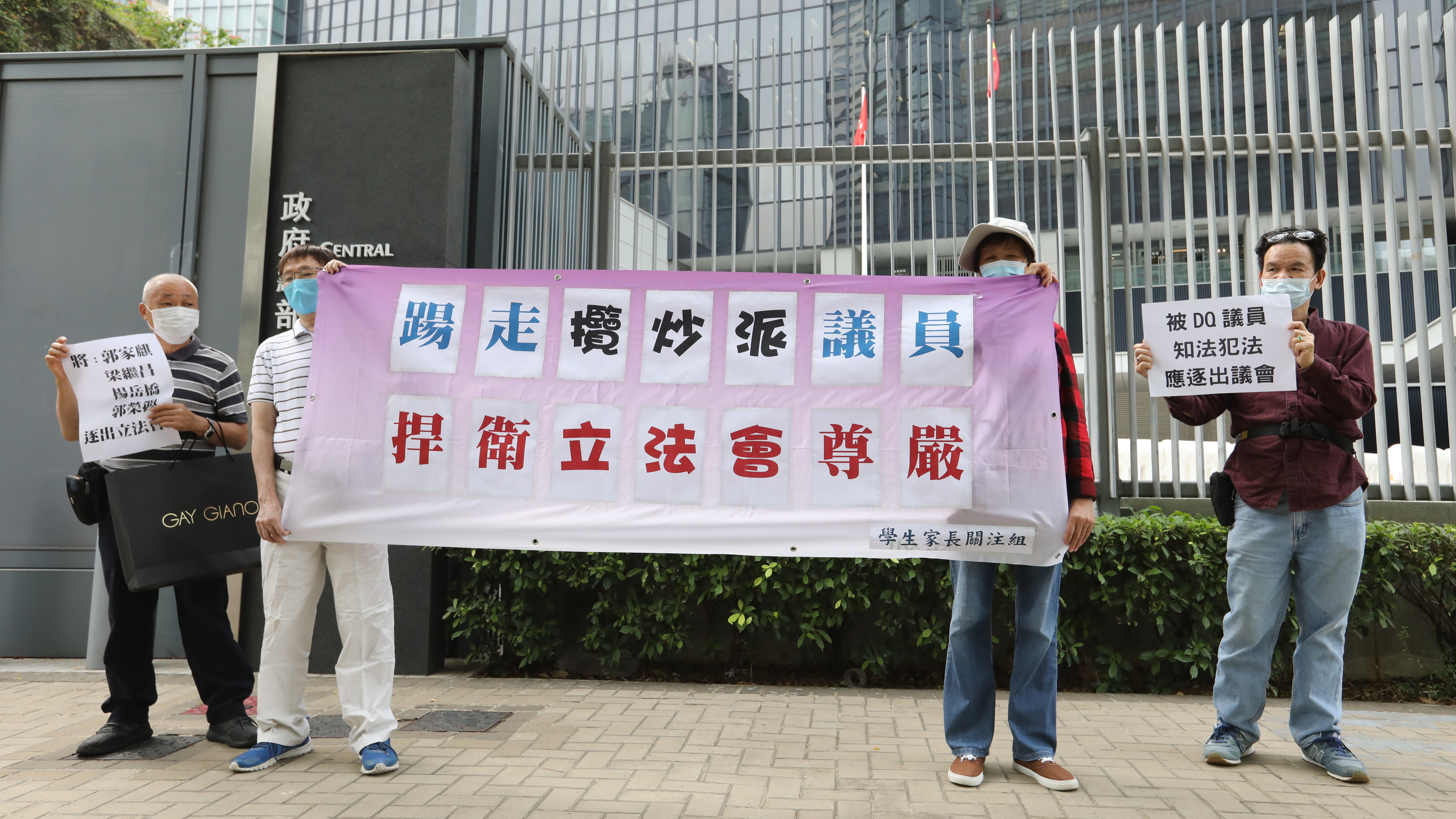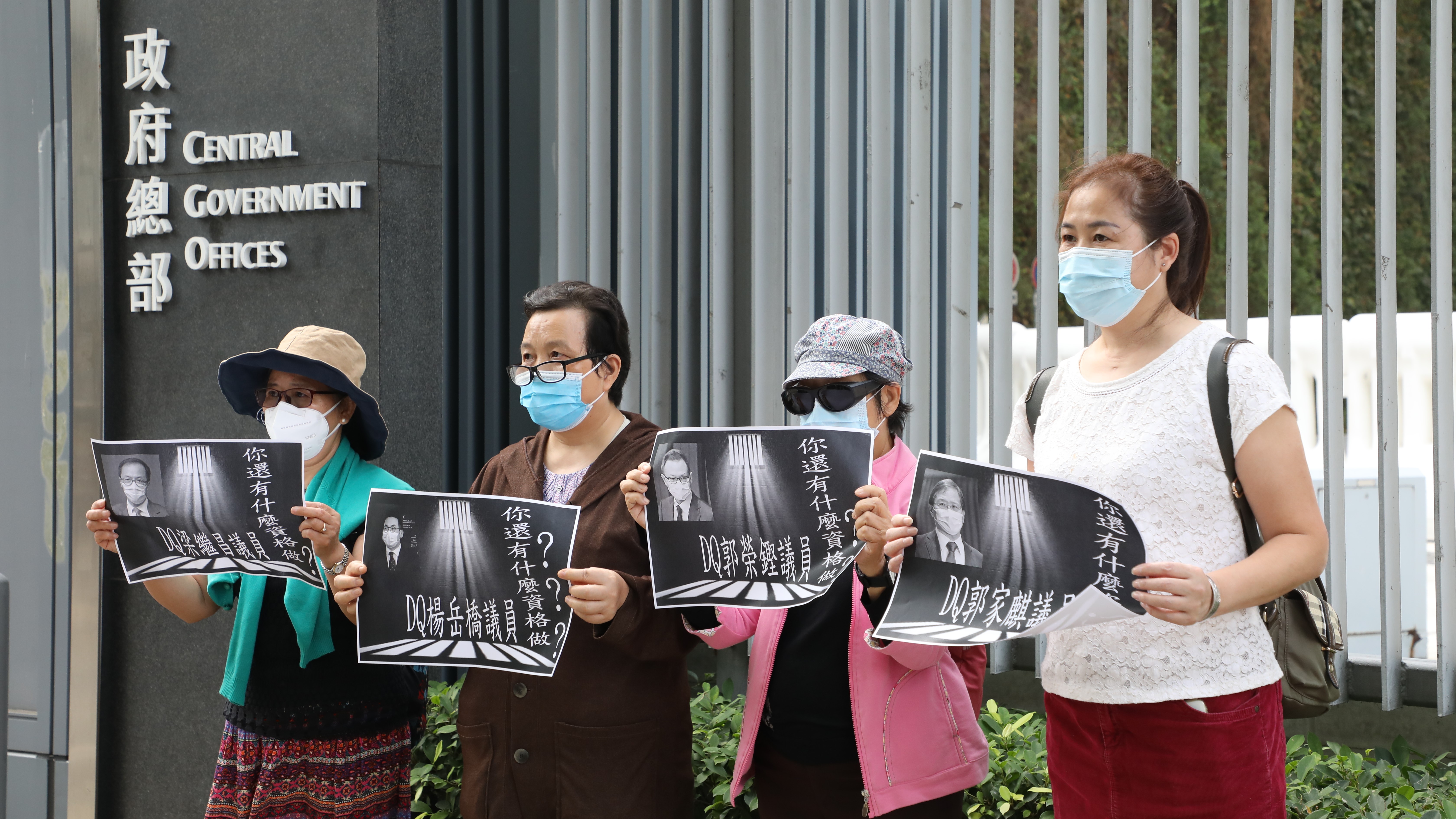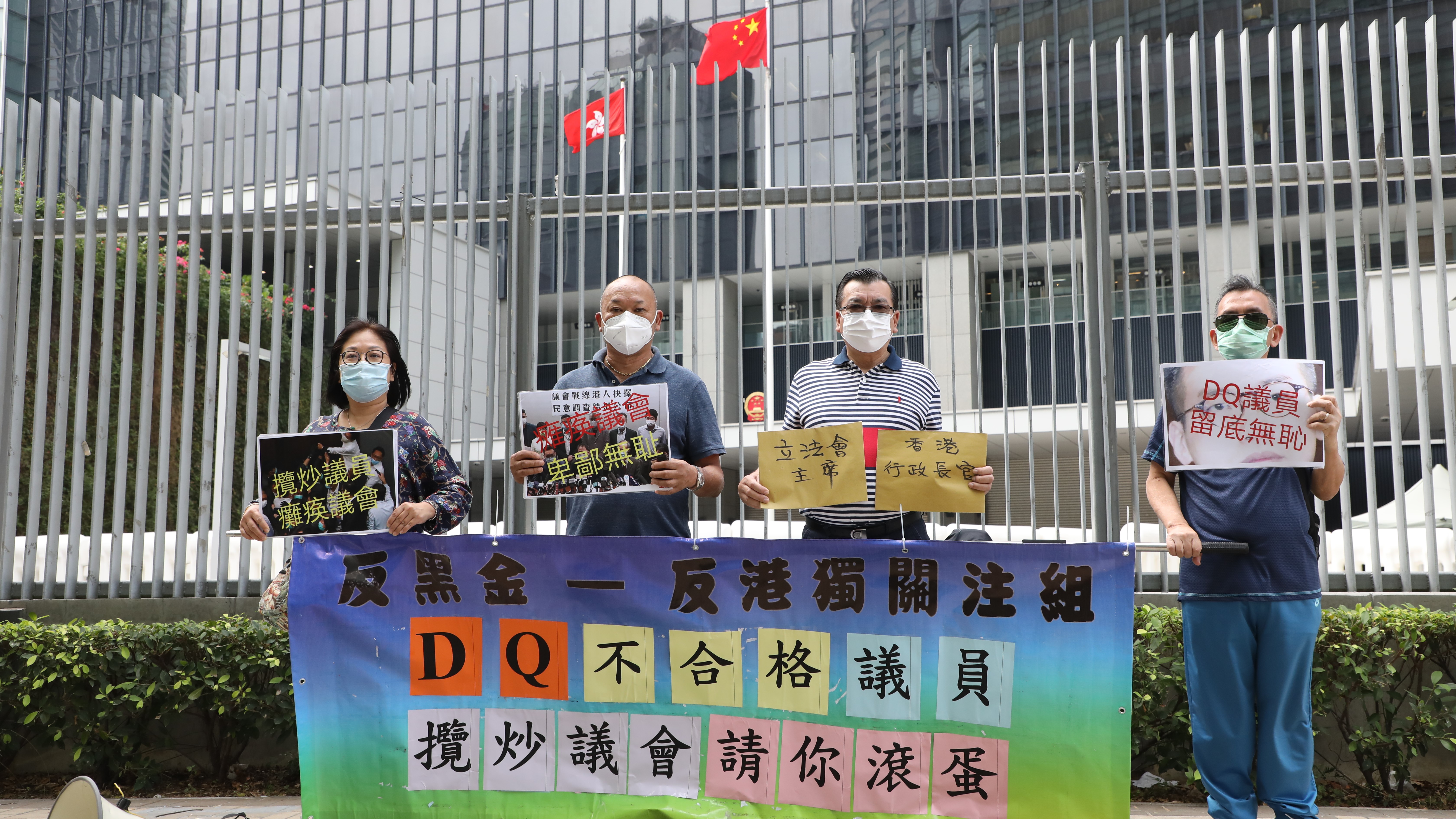 至少8個團體代表今日(9日)手持多幅橫額,強烈要求特區政府,撤消楊岳橋、郭榮鏗、郭家麒、梁繼昌四人的議員資格,逐出立法會。