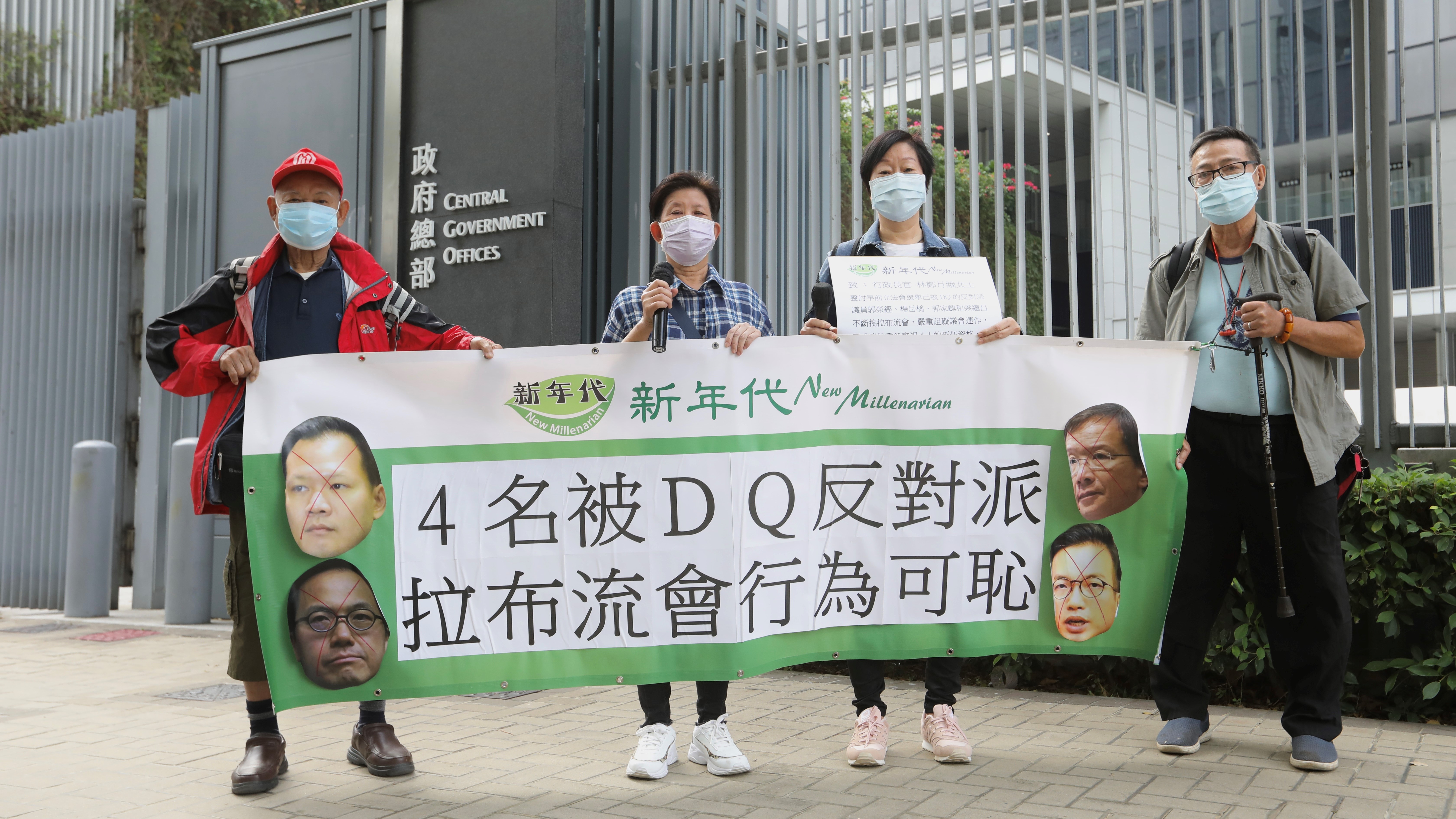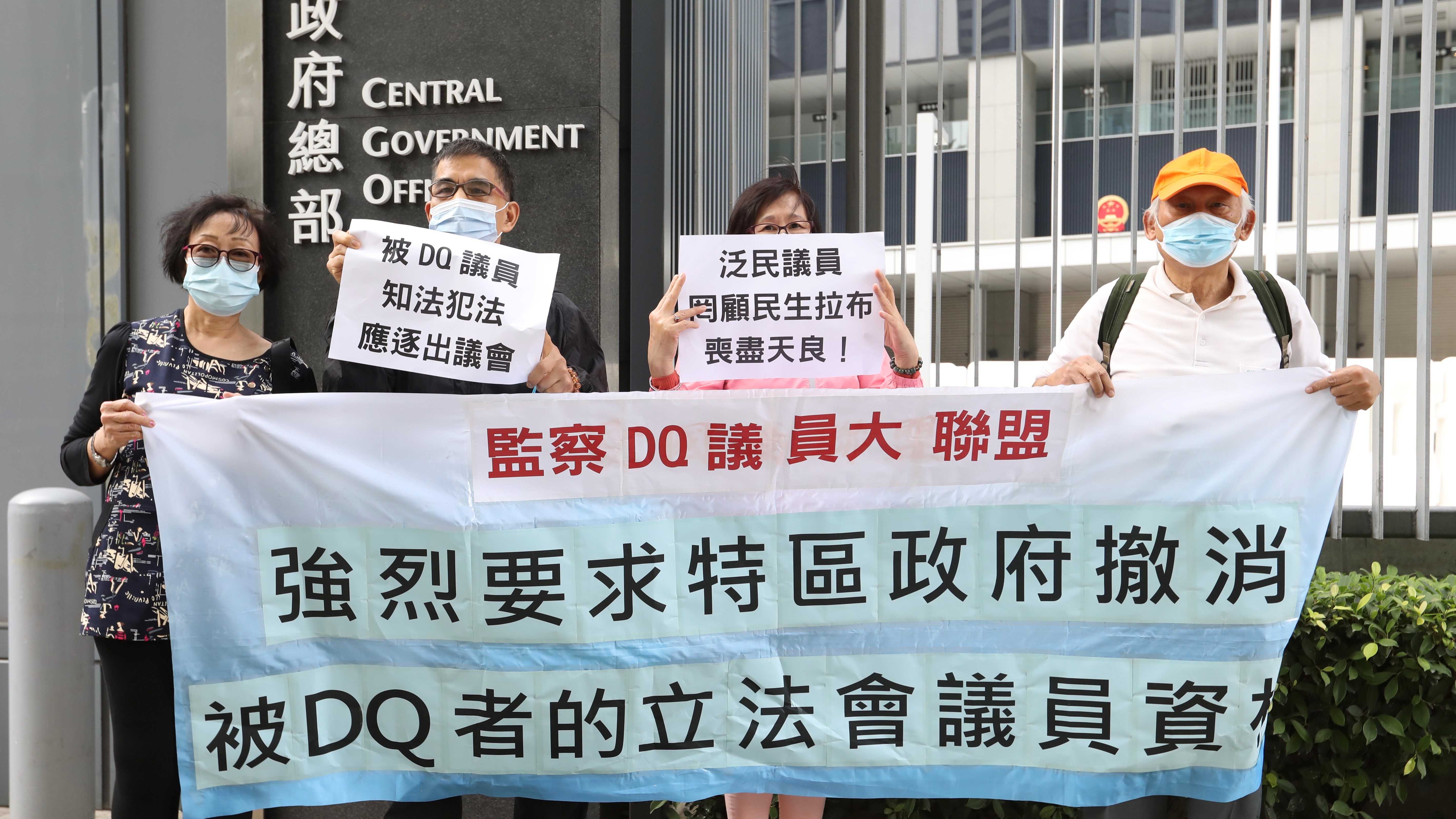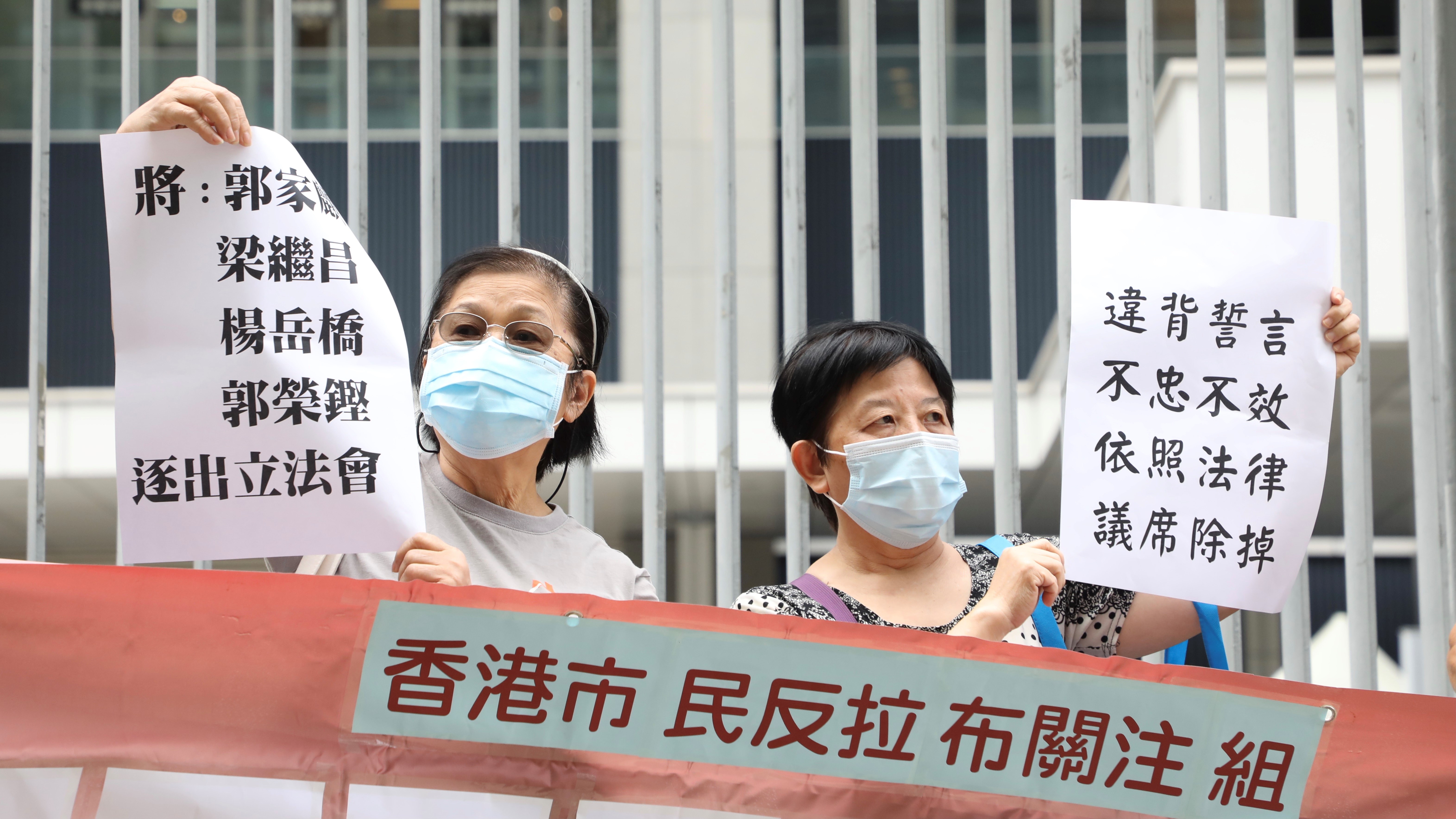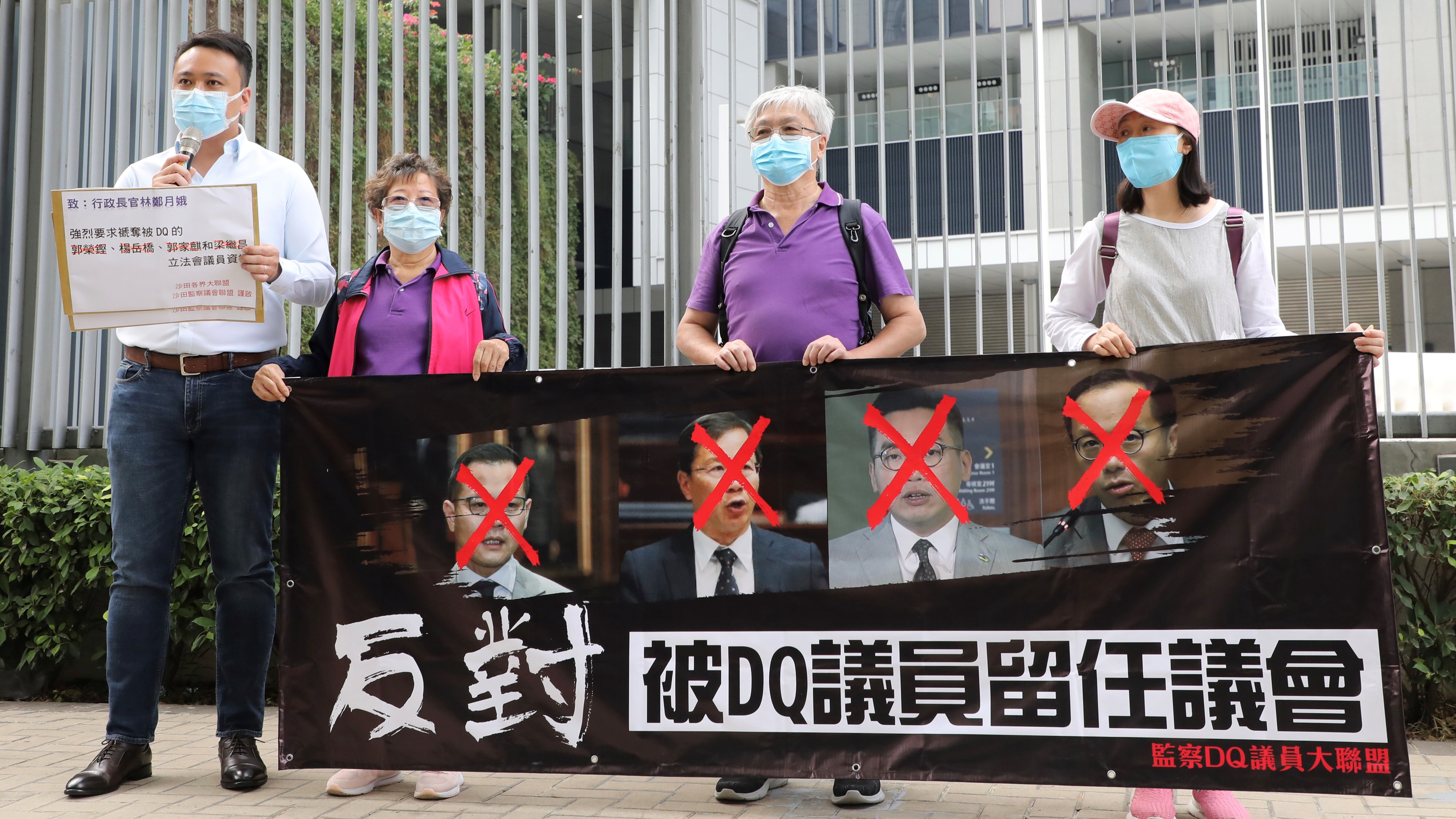 至少8個團體代表今日(9日)手持多幅橫額,強烈要求特區政府,撤消楊岳橋、郭榮鏗、郭家麒、梁繼昌四人的議員資格,逐出立法會。